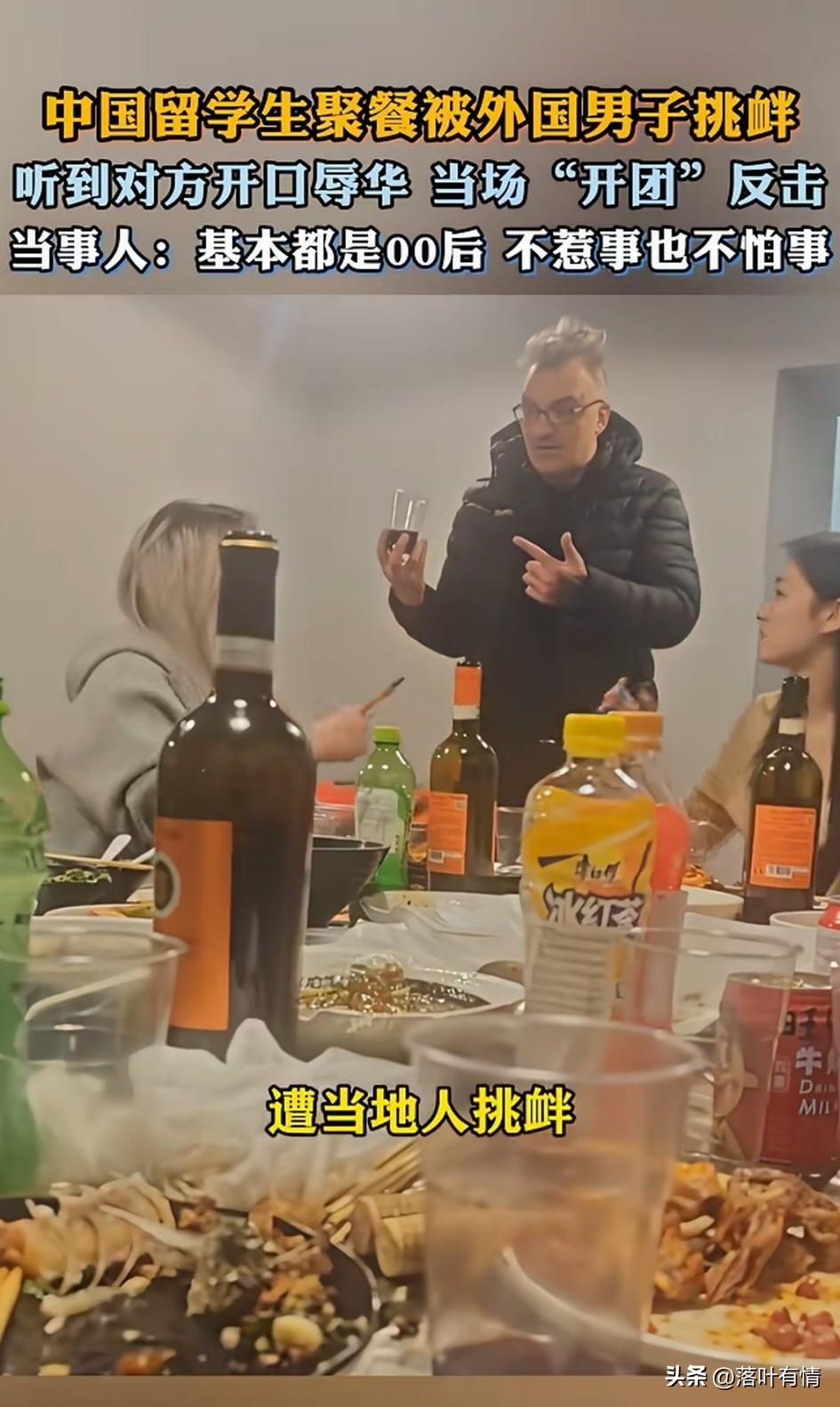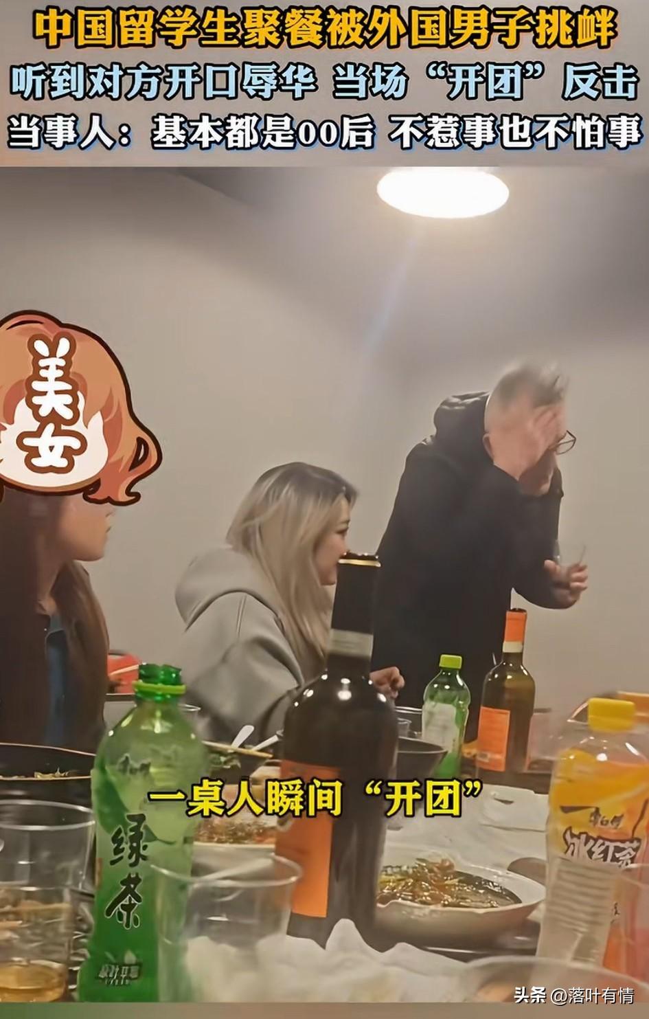 留学生在国外聚餐, 没想到一名老外走了过来, 给他们讨要了红酒, 出于善意她们不仅给了酒, 还给了对方递了烟, 没想到老外出口就辱华, 直接把留学生气坏了, 她们对着老外就是一顿输出, 还追出去教育了老外, 虽然在异国他乡, 但是她们丝毫不怂, 毕竟都是零零后, 不惹事也不怕事, 这样反击辱华的老外, 着实痛快, 她们把这段经历分享出来, 直接在网上引起了热议, 大家都在赞扬她们的行为, 感觉那老外实在是太坏了, 给他酒喝,给他烟抽, 结果他还辱华, 估计是平时华人对他们太好了, 这让他们产生了这样的想法, 谁知遇到的是国外的留子, 根本不惯着他们, 大家对于这样的女留学生怎么看? 女生留学生 留学生法国 留学生挑衅事件
