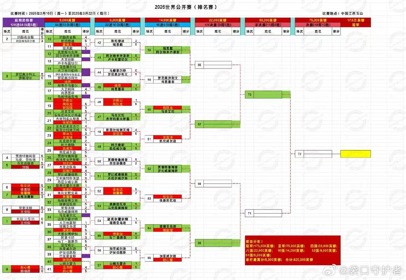 2026 世界公开赛第四天16进8中国选赵心童、周跃龙、吴宜泽、张安达、傅家俊等5人晋级16强;2026.3.19日 星期四第四轮 (9局5胜)14:00 直播:吴宜泽VS凯伦威尔逊 小窗:周跃龙VS马克艾伦19:30 直播:赵心童VS加里威尔逊 小窗:傅家俊VS塔猜亚乌诺
