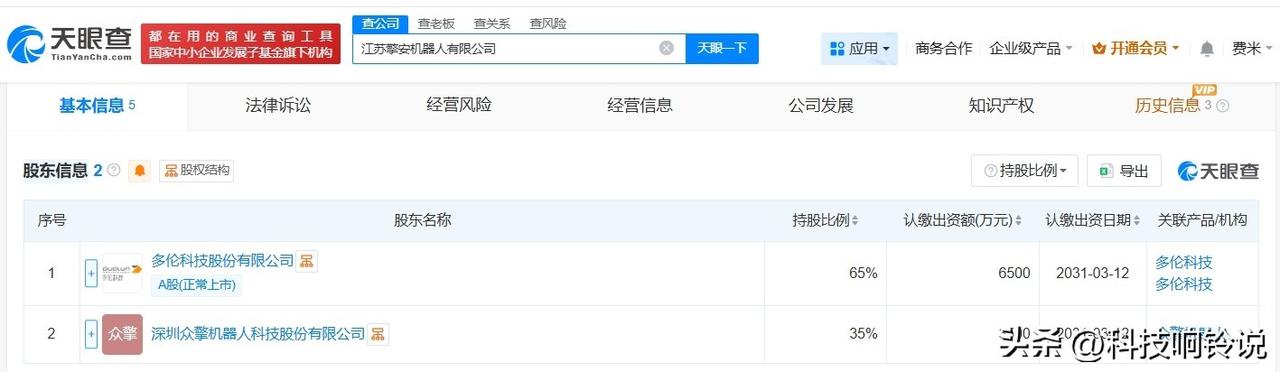 【众擎机器人、多伦科技在江苏成立擎安机器人公司 注册资本1亿】 天眼查工商信息显示,近日,江苏擎安机器人有限公司成立,法定代表人为章安强,注册资本1亿人民币,经营范围包括智能机器人的研发、工业机器人制造、服务消费机器人制造、人工智能应用软件开发等。股东信息显示,该公司由多伦科技(603528)、深圳众擎机器人科技股份有限公司共同持股。 天眼查信息: