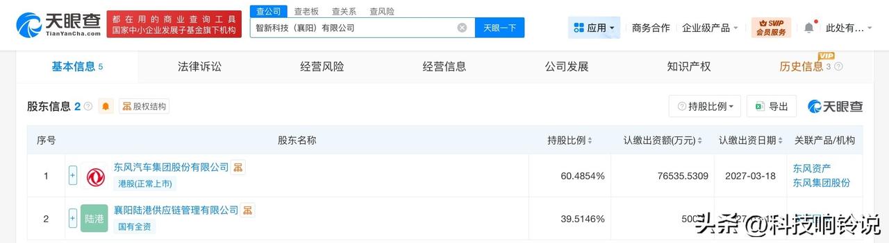 【东风汽车等在襄阳成立新科技公司 注册资本约12.65亿】 天眼查工商信息显示,近日,智新科技(襄阳)有限公司成立,法定代表人为江友,注册资本约12.65亿人民币,经营范围为技术服务、技术开发、技术咨询、技术交流、技术转让、技术推广,汽车零部件及配件制造,汽车零配件批发,货物进出口,技术进出口等。股东信息显示,该公司由东风汽车集团股份有限公司、襄阳陆港供应链管理有限公司共同持股。 天眼查信息: