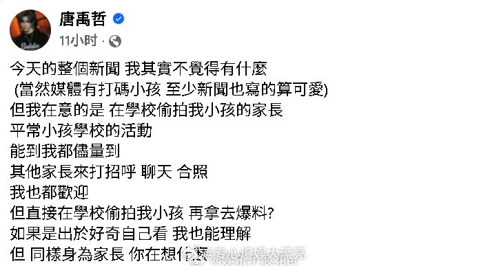 唐禹哲怒斥偷拍小孩家长唐禹哲透露,他在学校活动中尽力参与子女生活,对其他家长的正常交流(如打招呼、合照)持开放态度,但发现有家长直接偷拍其孩子照片并用于爆料。他无法理解这种行为,强调若出于好奇私下观看尚可接受,但同为家长却将孩子隐私公开传播令人愤怒。