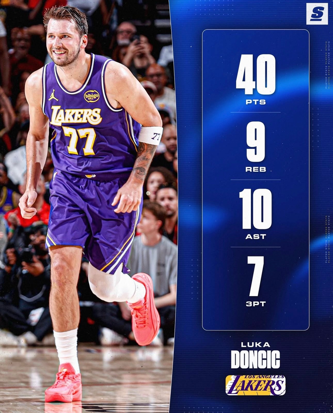 东契奇出战38分钟,投篮25中12,三分17中7,罚球14中9,得到40分9篮板10助攻1抢断。