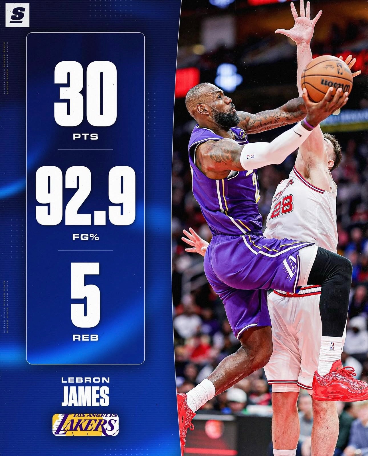 詹姆斯出战34分钟,14投13中(一球不进)!砍下30分5板2助1断1帽!