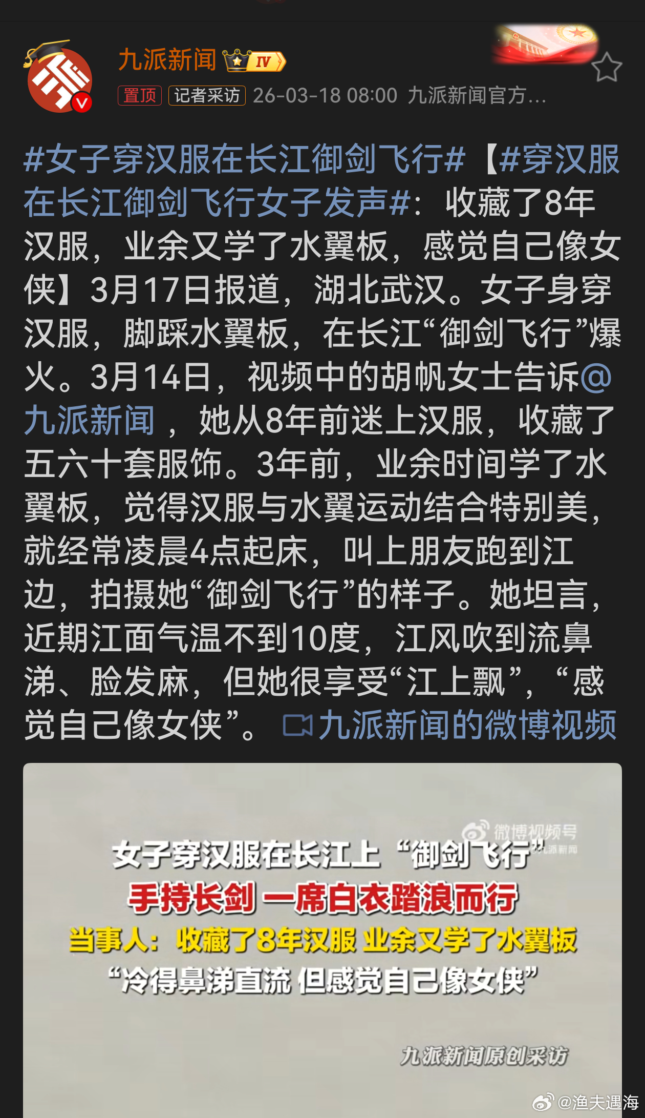 穿汉服在长江御剑飞行女子发声胡帆女士的“长江御剑飞行”太有创意了!8年汉服收藏,3年学水翼板,将传统与现代运动完美融合,展现独特美感。即便江边寒冷、早起辛苦,她仍乐在其中,这份热爱和坚持值得点赞,也让我们看到了生活别样的精彩。认真生活就会发光平凡岗位上的坚守