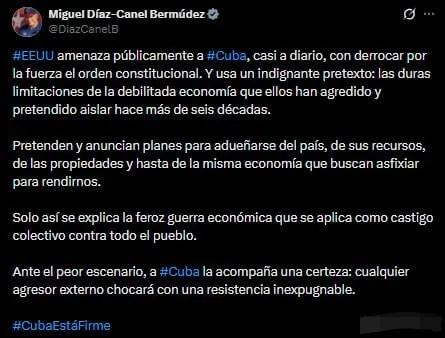 古巴总统发推文宣示,针对美国侵略者将会是坚不可摧的抵抗! 面对美国政府近期不断升级的威胁,古巴国家主席迪亚斯-卡内尔在社交媒体上强硬回应,称任何外来侵略者都将遭遇坚不可摧的抵抗。 此前,特朗普多次公开表示将“接管古巴”,并计划在解决伊朗问题后对古采取“ imminent action”。美方还施加严厉石油封锁,导致古巴全国性停电,民生艰难。 古巴强调,其经济困境正是美国长达60余年的封锁所致,美方却以此为动武借口,实为“集体惩罚式的经济战”。 目前,这一对抗已引发国际关注,俄罗斯、墨西哥等国发声支持古巴,担忧局势滑向军事冲突。历史上的猪湾事件与冷战阴影,使古巴对主权问题极为敏感,此次强硬表态既是对外威慑,也是对内凝聚民心。