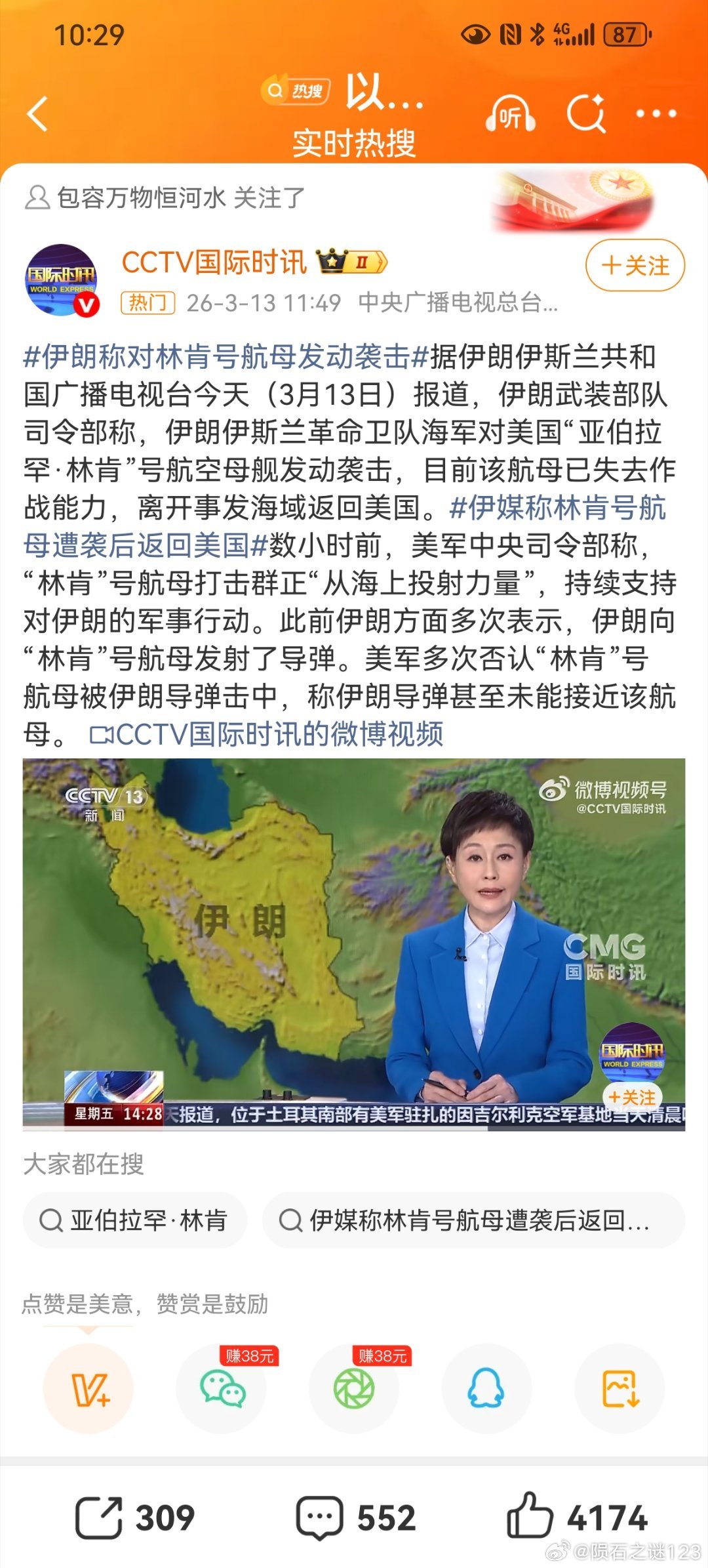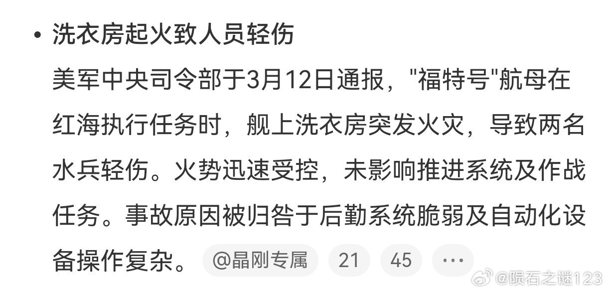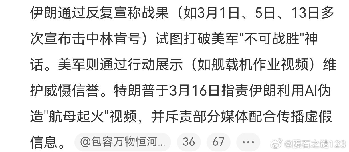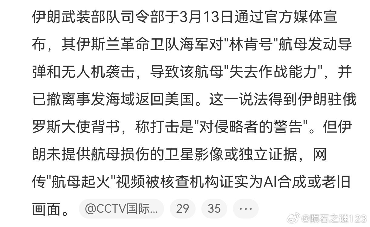 伊朗袭击美军航母的时间,与林肯号航母起火事故发生时间,高度吻合。出于认知战、舆论战的需要,美国必须矢口否认航母被伊朗击中的事实,而伊朗受自身实力限制,也拿不出实证证明林肯号航母被导弹和无人机击中的证据。这次美军和以色列对伊朗发动攻击,三艘航母压境中东,究竟在战场上发挥了多大作用,只有天知地知美国知了。个人以为,伊朗攻击美军航母,只是警告式的、象征性的做出一个战斗姿态。如果集中火力击沉一艘航母,必然会激怒川普,投入更多的兵力,对伊朗展开灭国之战。美将只剩一艘航母用于对伊朗袭击