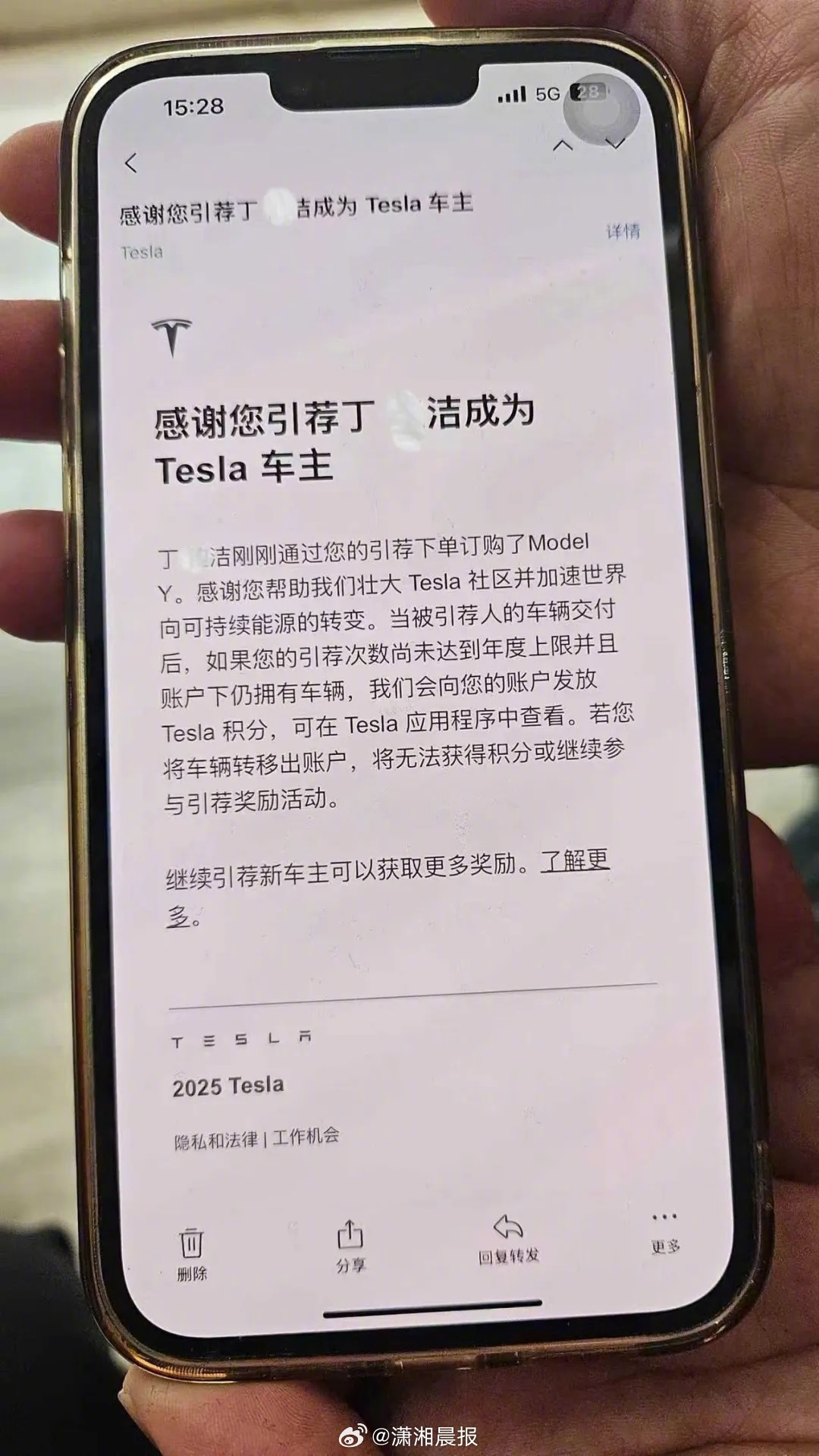 【#引荐买车却没收到奖励疑被张冠李戴#,#特斯拉回应车主引荐买车没收到奖励#,20多天未给出解释】车主引荐他人购买特斯拉,引荐者和购车者都会得到相应奖励,这是车企特斯拉长期执行的一项营销策略。近日,长沙市民刘先生向·晨视频反映,他在去年成功引荐一位网友陈先生购买了特斯拉,后来还收到了特斯拉官方邮件确认,却迟迟没有收到奖励。刘先生追问购车销售,对方称原购车者取消了购车,所以奖励就没有了。 刘先生从该网友处确认,对方确实是成功购车了,并且是使用了刘先生的推荐链接。更蹊跷的是,刘先生发现特斯拉所称的已经取消购车的消费者“丁某洁”,他和陈先生均不认识。这一系列操作让刘先生直呼“看不懂”。潇湘晨报·晨视频记者联系上相应订单的特斯拉销售人员。工作人员表示无权接受采访,建议联系特斯拉客服。记者联系特斯拉客服后,有特斯拉客对外事务工作人员回复称将介入调查。记者从2月底至3月18日期间多次询问,截至发稿,仍未得到明确答复。刘先生则表示,在记者介入后,有特斯拉门店工作人员联系他,称将采用重新关联其他陌生购车人的方式给予他积分补偿。 长沙