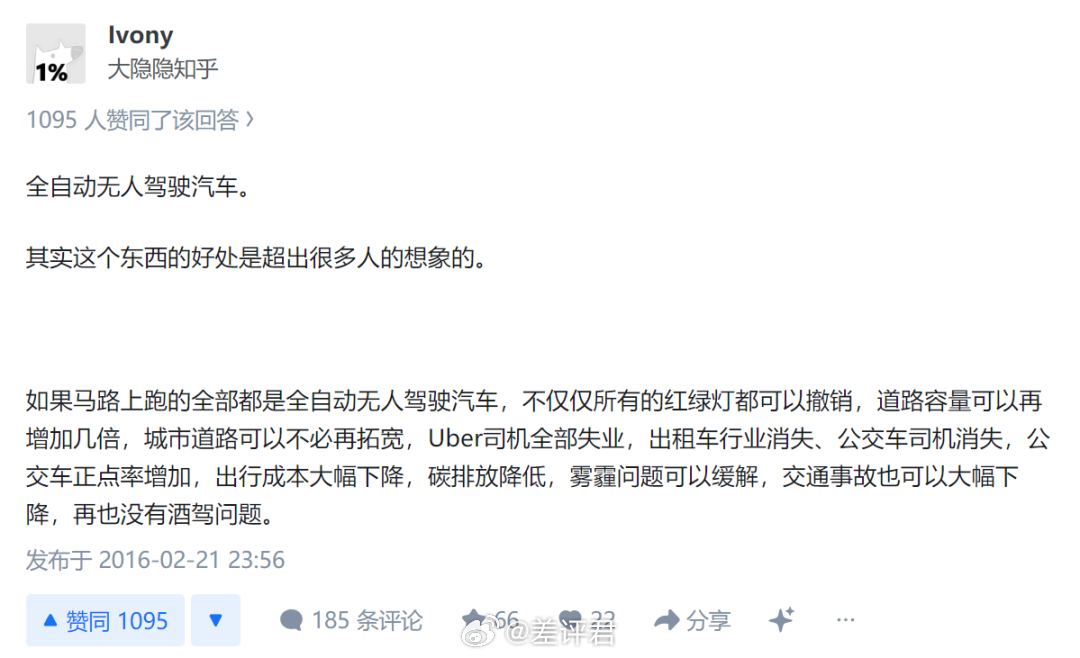 当然了,也不是所有“许愿”最后都百分百落地了,比如关于无人驾驶的想象。201 年有网友详细描述了无人驾驶汽车的好处:撤销红绿灯、增加道路容量、出行成本大幅下滑、酒驾问题消失。。。十年后的今天,这件事确实在发生,但也还没走到那一步。