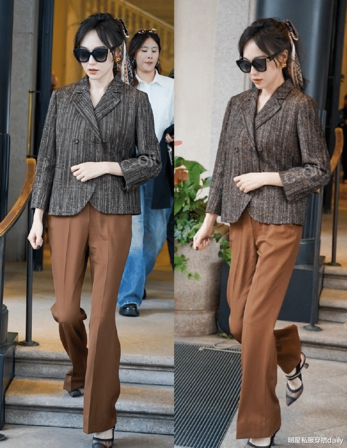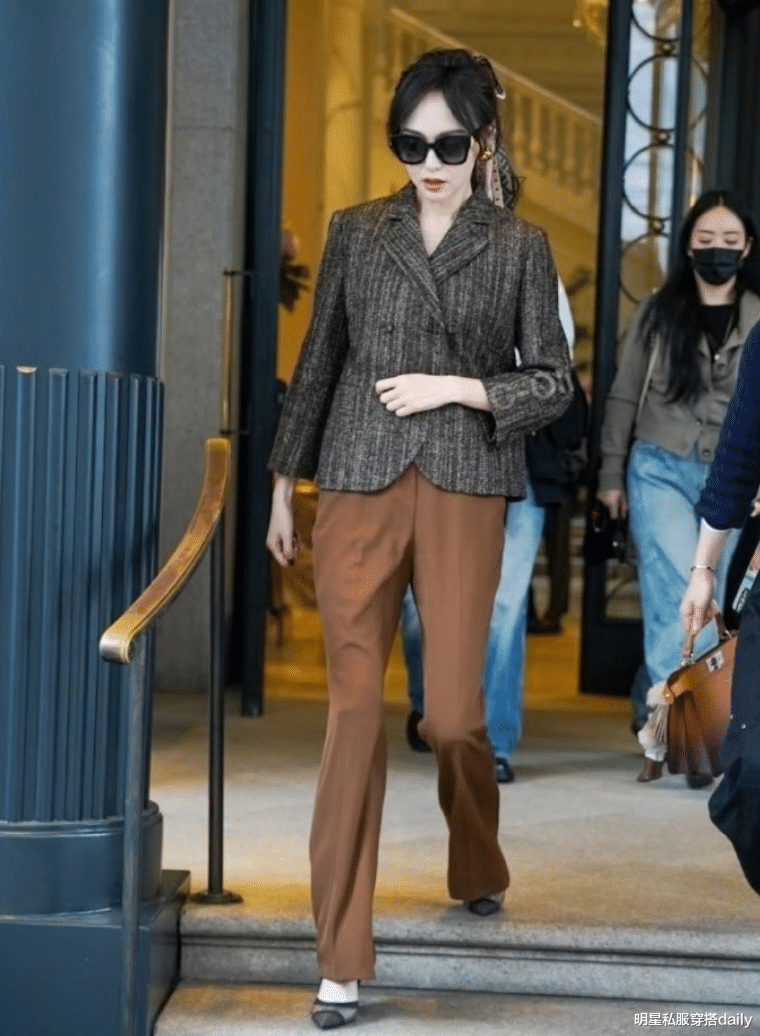 不过,在此次米兰行程的转场期间,唐嫣的另一套穿搭却引发了不小的热议。当时她身着灰色小西装外套,搭配棕色西装长裤,脚踩撞色设计的镂空尖头高跟鞋,有部分声音认为这套造型略显老气,甚至调侃是 “中老年套装”,直言让 40 岁的她穿出了 50 岁的既视感。