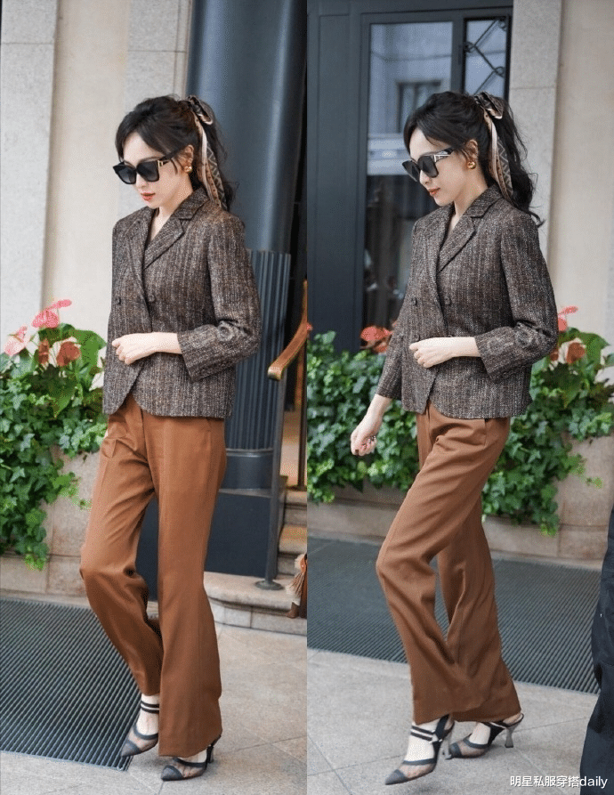 这套西装采用独特的拼接色设计,缎面深棕色与黄棕色相互碰撞融合,高级质感扑面而来,不仅完美契合秋日的温暖氛围,更在视觉上拉长了身形比例,让本就高挑的她更显挺拔。