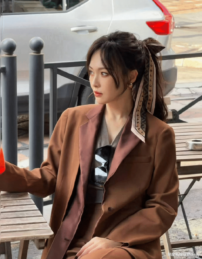 在发型与配饰的搭配上,唐嫣也尽显巧思。她将标志性的长卷发高高扎起,利落的高马尾瞬间注入青春活力,打破了秋日穿搭可能存在的沉闷感;而马尾边上缠绕的棕色印花丝带,与整套造型的色调相呼应,为整体造型增添了浪漫的氛围感,每一个细节都尽显时尚品味。