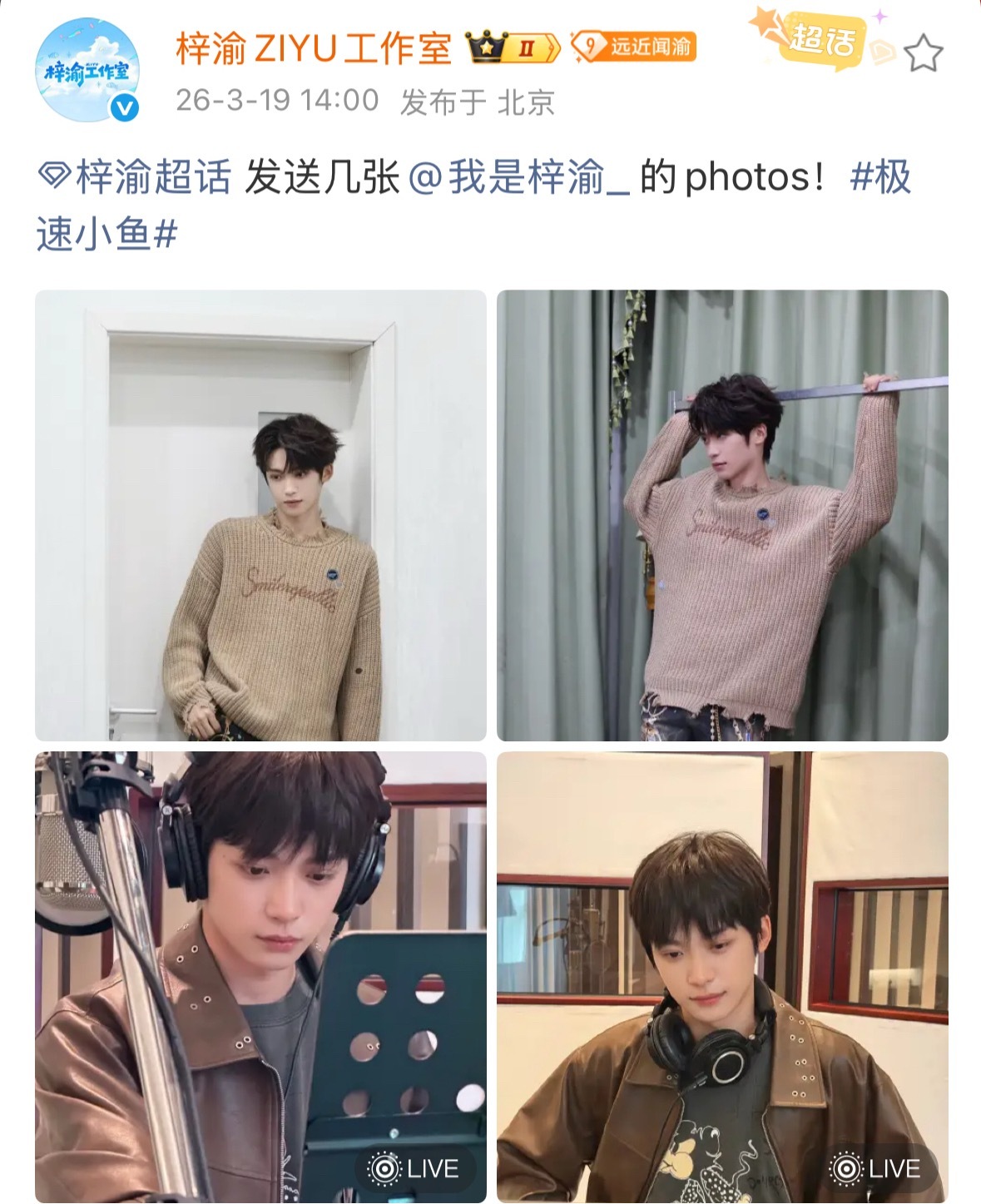 梓渝在录新歌了工作室晒梓渝录歌照工作室晒了梓渝录歌live照,是在准备新专辑的新