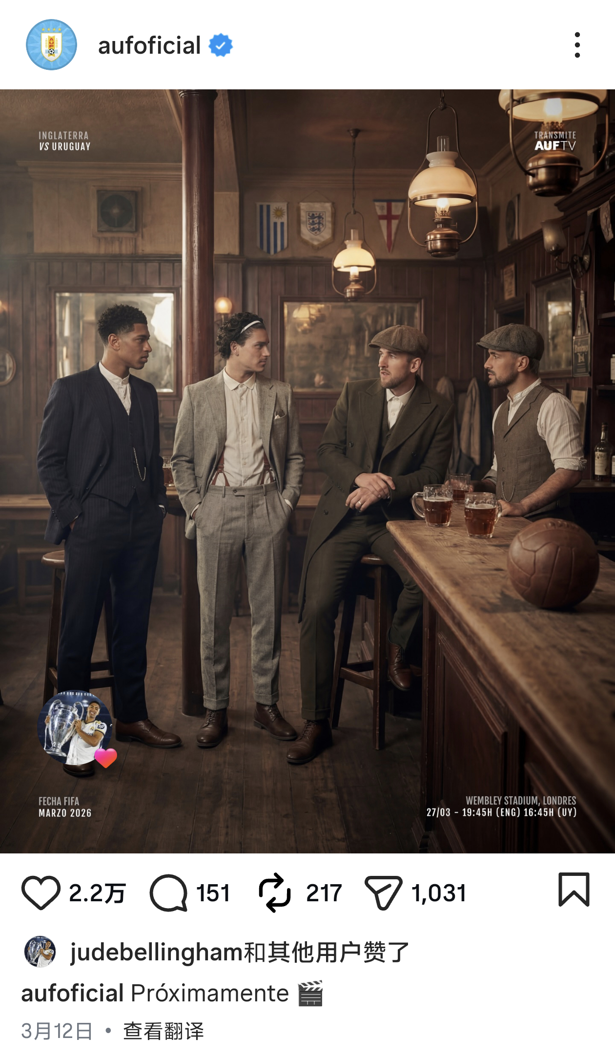 贝林赞了一张乌拉圭媒体把英格兰和乌拉圭球员p成剃刀党的图片(英格兰和乌拉圭即将在国际比赛日迎来比赛)
