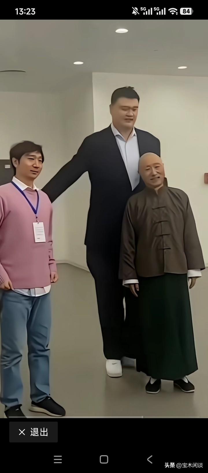 姚明和陈佩斯父子合影,无论怎么站位,奈何不成比例呀。我看了一下视频影像,陈佩斯这个人是非常讲礼节的,他先是谦让地将姚明放在中间C位上,自己和儿子陈强分列于两侧;后来姚明投桃报李,可能觉得这样的站位,显得对陈佩斯父子不太恭敬,所以又将陈佩斯让到C位上,不得不说他们的人品都是无可挑剔的。只是由于身高的差距悬殊,让观众在视觉上受到不小的冲击,一般人估计没那个勇气跟姚明去合影吧。
