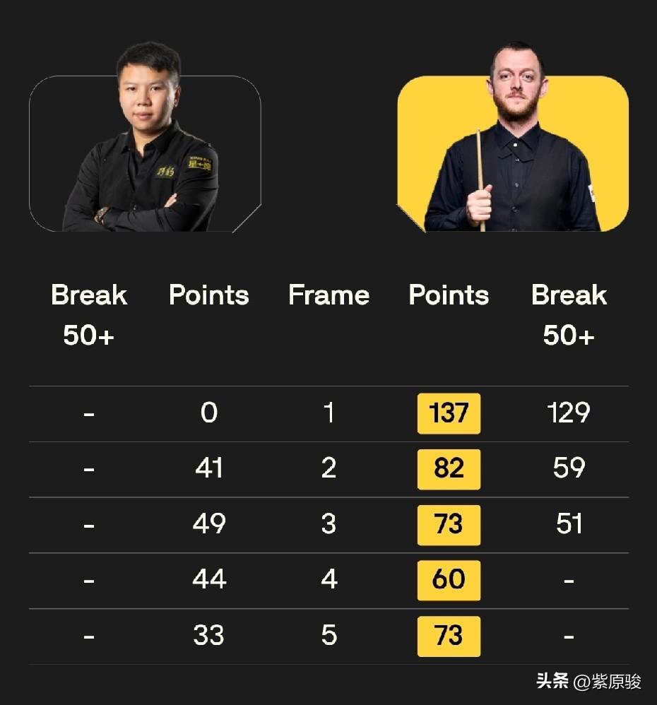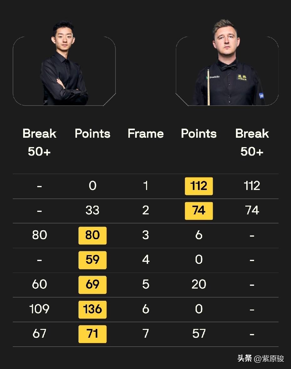 吴宜泽5-2击败凯伦·威尔逊,强势晋级世界公开赛8强,吴宜泽0-2落后五连鞭。周跃龙0-5被艾伦横扫出局,火箭5-3战胜墨菲。 吴宜泽开局后0-2落后,让人有点担心,没想到之后吴宜泽发起反攻,连赢5局,其中赛点局第7局,吴宜泽71-57逆转。 与此同时,周跃龙被艾伦五连鞭,0-5败下阵来。从比赛过程看,周跃龙完全落入艾伦的节奏中,除第一局没有得分外,后面四局都得了分,而且分差都不大。周跃龙与艾伦之前多次交手,基本都是周跃龙失利,看来周跃龙对艾伦还是有很重的心理阴影。 火箭奥沙利文今天不错,5-3击败墨菲,3-3之后,火箭连赢两局。 下午时段最后一场比赛还在进行中,瑞恩·戴目前4-3领先齐津斯。 今天19点30分,赵心童对阵加里·威尔逊,傅家俊迎战塔猜亚,张安达对阵瓦菲,特鲁姆普对阵罗比·威廉姆斯。 恭喜吴宜泽,中国球员加油!