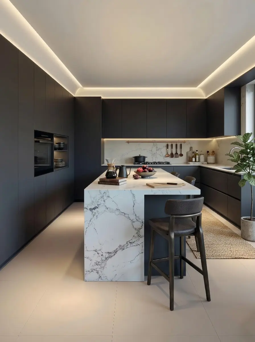 步入室内,开放式西厨与餐厅无缝衔接。深咖色通顶立柜搭配大理石岛台,冷暖交织。嵌入式灯带不仅是光,更是空间的呼吸线,让备餐也极具仪式感。