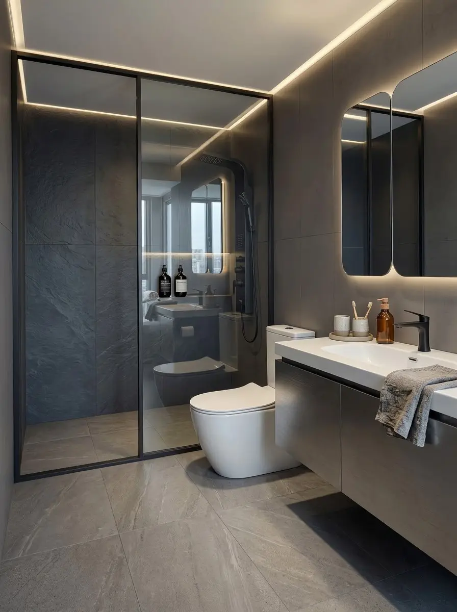卫浴间采用岩板贴面,搭配悬浮式浴室柜与镜柜,利落的线条感极大提升了空间的通透度,在水雾氤氲中也能感受秩序之美。