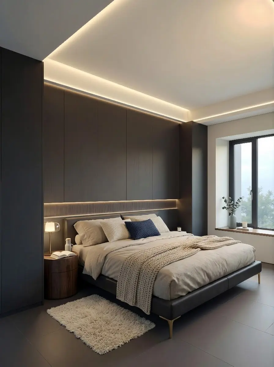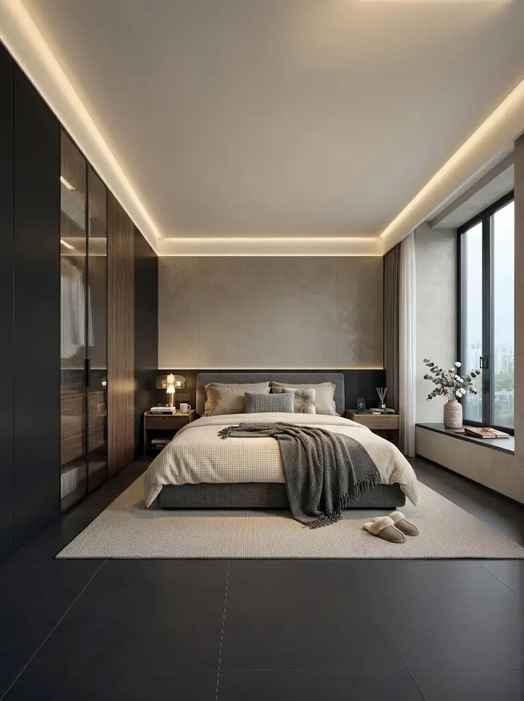 卧室延续了低饱和度色调,无主灯设计让光影如丝绸般流淌。巨大的落地窗将城市风景框进室内,一榻、一枕、一盏暖灯,便是卸下疲惫的终极归宿。