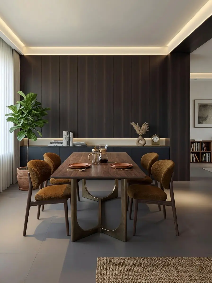 客厅摒弃繁杂,大面积木质格栅背景墙与黑理石电视背板勾勒出沉稳基调。焦糖色餐椅点缀其间,打破沉闷,为公共区域注入一份恰到好处的法式慵懒。