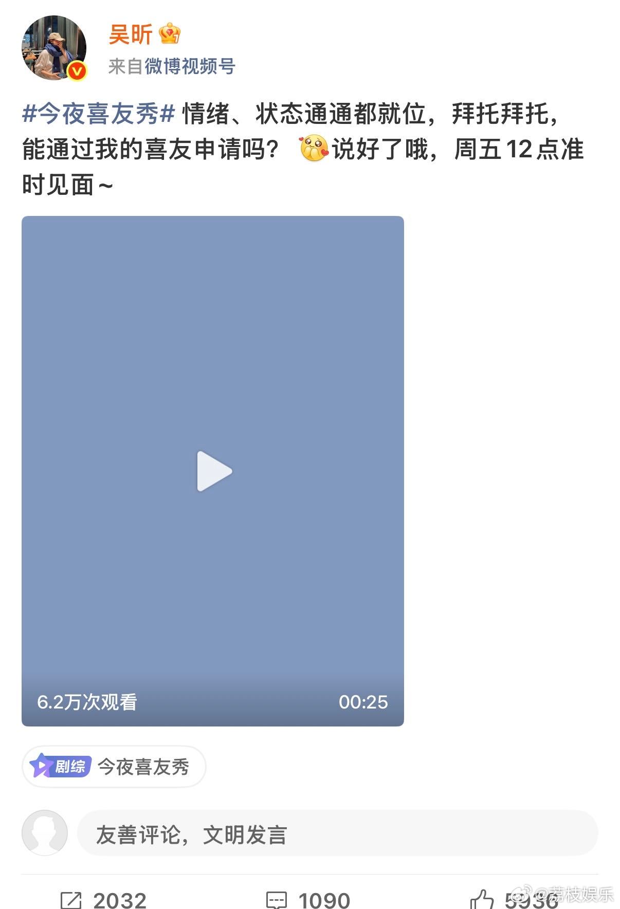 吴昕发出喜友申请谁还没收到吴昕的喜友申请!我先冲了!昕姐可是娱乐圈的暖心小可爱,综艺感爆棚还特别真实,明天中午12点准时上线,和昕姐一起嗨玩今夜喜友秀今夜喜友秀