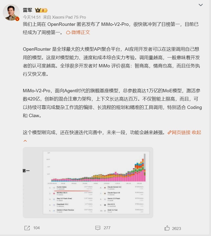 雷军回应大模型火了 “我们上周在OpenRounter匿名发布了MiMo-V2-Pro,很快就冲到了日榜第一,目前已经成为了周榜第一”