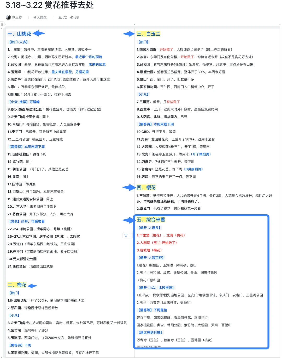 图1:是北京3~5月主要赏花品种的日历图 包含 1.各类花,什么时间看 2.主要赏花公园,有什么品种 3.其中比较好看,出名的花主要在哪儿 (标了2颗❀,就是值得去;3颗❀就是顶流了) (没时间的,跟这种就行) 图2:是最近一周玉兰,山桃,梅花,樱花 开放的情况,比较推荐的出去有哪些 PS.郊区的我还在弄,大概这两天出来 PS.信息是根据我自己的踩点,以及赏花群里姐妹反馈整理的,真实可靠,及时 特别感谢: 等给的反馈和花开实况