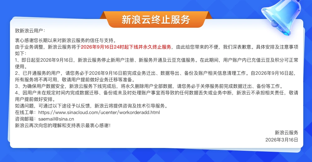 据公告安排,即日起至9月16日,新浪云将停止新服务开通及云豆充值,已充值云豆可正常使用。新浪云强烈建议现有用户务必在此期间完成业务迁出、数据导出与备份,服务下线后所有用户数据将被永久删除,且平台对未及时迁移导致的数据丢失或业务中断不承担相关责任。