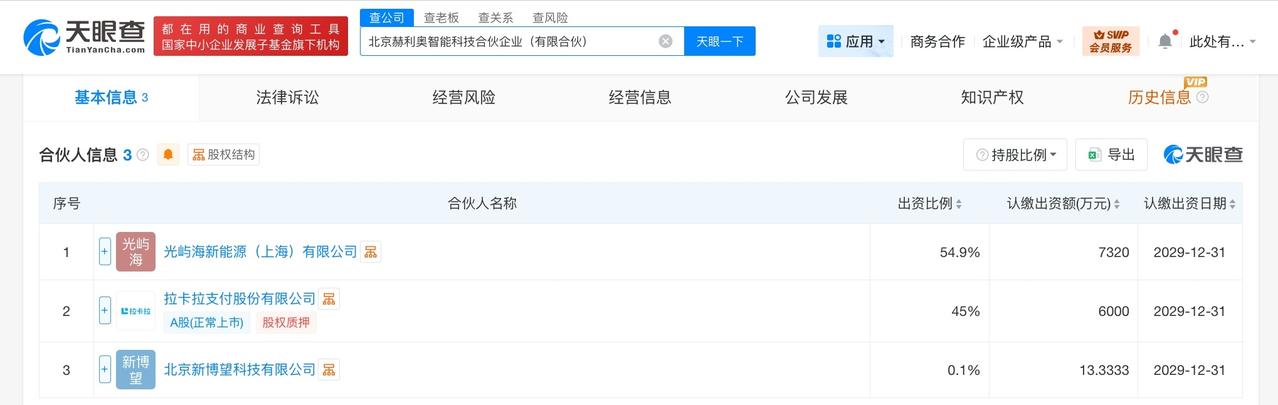 拉卡拉等1.3亿成立智能科技合伙企业 含多项人工智能业务 天眼查工商信息显示,近日,北京赫利奥智能科技合伙企业(有限合伙)成立,执行事务合伙人为北京新博望科技有限公司,出资额约1.3亿人民币,经营范围为人工智能基础软件开发、人工智能应用软件开发、人工智能行业应用系统集成服务、大数据服务、光伏设备及元器件销售、储能技术服务等。合伙人信息显示,该企业由光屿海新能源(上海)有限公司、拉卡拉(300773)、北京新博望科技有限公司共同出资。 天眼查信息: