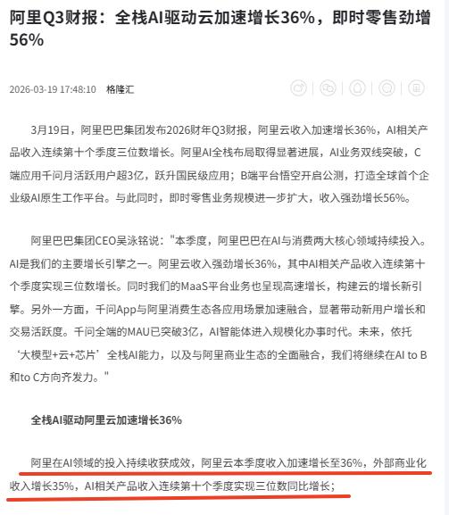 阿里巴巴财报公开,两个没想到,但又在意料之中! 第一,阿里在AI领域的投入很大,回报更大。从阿里Q3财报来看,阿里云收入加速增长至36%,AI相关产品收入连续第十个季度实现三位数同比增长。 营收层面之外,阿里的收获同样喜人,比如千问C端月活跃用户超3亿,成为了阿里生态下又一个国民级应用。 大伙可不要不小瞧这个变化,千问连接的是整个阿里生态业务,用户可以在千问上实现AI点外卖、订票、打车,代表的是AI时代办事的超级入口,未来潜力巨大。 第二,阿里持续投入即时零售,势能正在溢出。我们知道,即时零售的天花板不是外卖可以比的。而阿里布局即时零售,落点是大消费战略,让消费者的需求在阿里生态中可以实现一站式满足。 可以看到,在季度内,阿里即时零售业务规模进一步扩大,收入强劲增长56%。再往大了看,淘宝APP月活用户同步双位数提升,背后即时零售功不可没。 道理很简单,消费者在淘宝闪购点外卖,形成习惯,当要网购东西、订车票,他们首先就会想到淘宝、想到飞猪。 现在各行各业都不容易,而阿里拥抱变化、主动变革,发展越来越好,也算是给很多民营企业提供了参考。说实话,我还是很佩服阿里巴巴这家企业的。