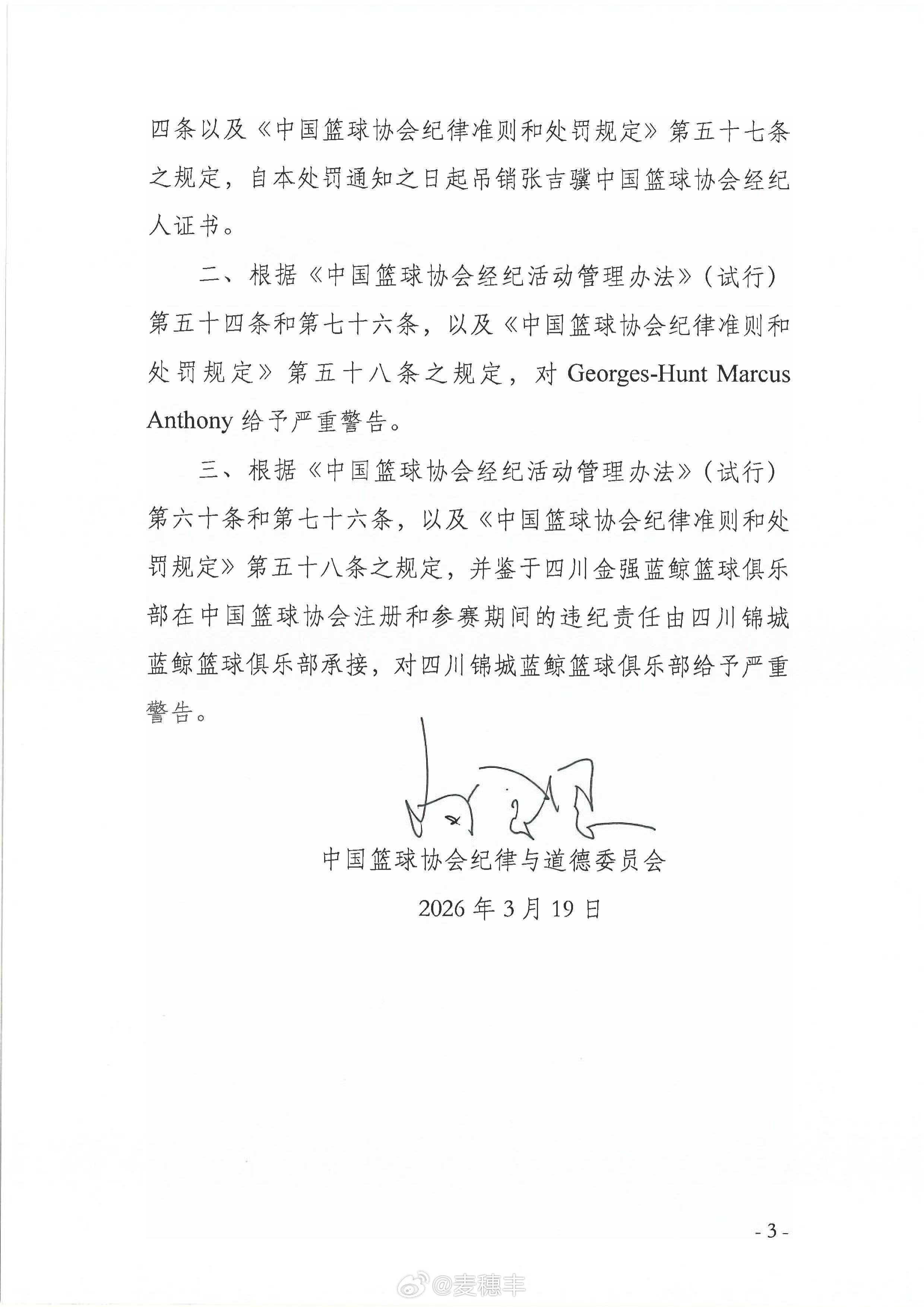 中国篮球协会纪律与道德委员会发布处罚决定,因合同存在严重违规,篮球经纪人张吉骥被