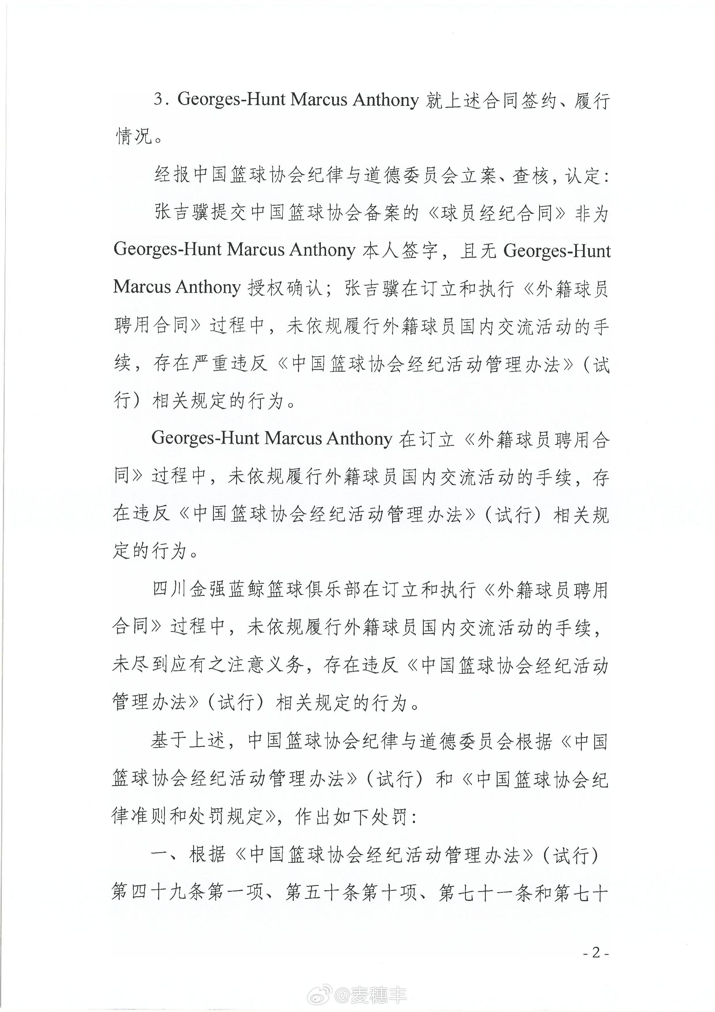 中国篮球协会纪律与道德委员会发布处罚决定,因合同存在严重违规,篮球经纪人张吉骥被吊销中国篮协经纪人证书,外援马库斯·乔治-亨特和四川锦城蓝鲸篮球俱乐部均被严重警告。四川男篮