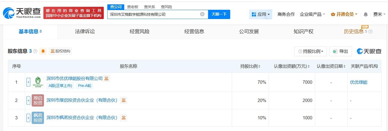 优优绿能等成立数字能源科技公司 注册资本1亿 天眼查App显示,3月19日,深圳