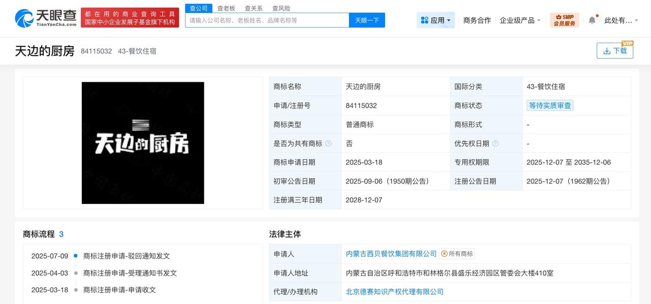 西贝已注册多枚新品牌商标 西贝已注册天边商标 据媒体报道,西贝创始人贾国龙的最新创业项目“天边砂锅焖面”已在北京落地。贾国龙透露,希望有个新品牌能够承接一部分西贝门店和员工。 天眼查知识产权信息显示,西贝关联公司内蒙古西贝餐饮集团有限公司已申请注册多枚“天边”“天边的厨房”商标,国际分类涉及医疗园艺、餐饮住宿等,当前部分商标已注册成功。 内蒙古西贝餐饮集团有限公司成立于2017年10月,法定代表人为贾国龙,注册资本约1.04亿人民币,经营范围含餐饮服务、食品生产、食品互联网销售、食品销售等。股东信息显示,该公司由北京西贝企业管理有限公司、贾国龙、呼和浩特市人生喜悦企业管理中心(有限合伙)等共同持股。 天眼查信息: