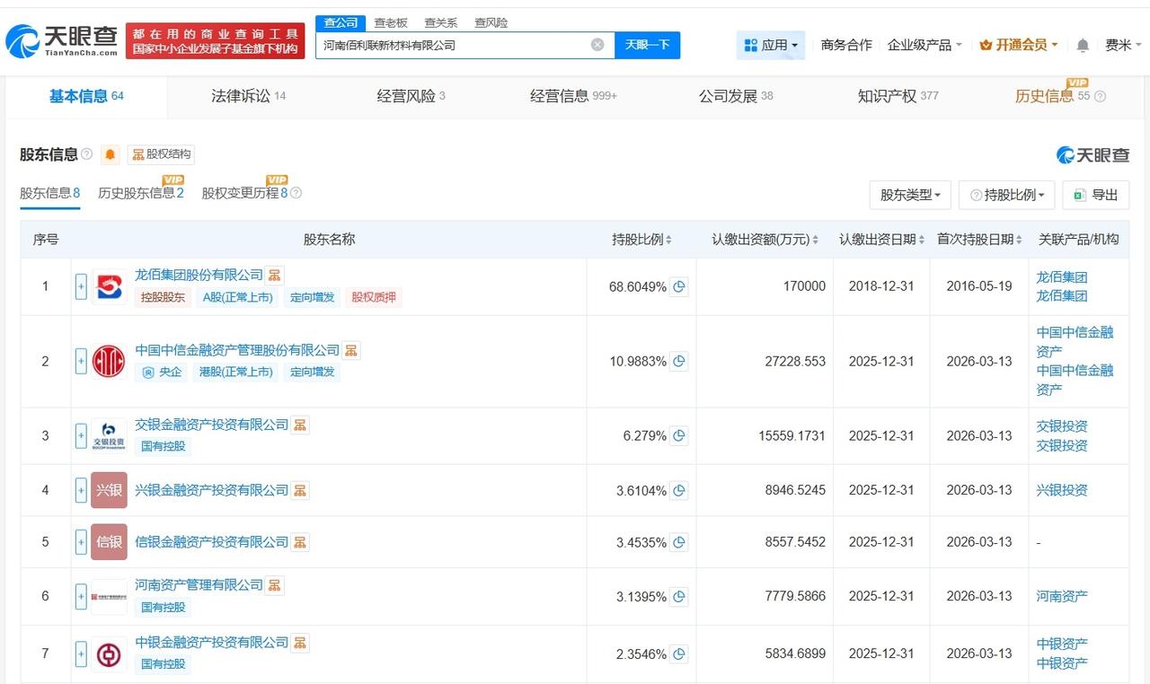 龙佰集团旗下佰利联新材料公司增资至24.8亿 增幅约46% 天眼查App显示,近日,河南佰利联新材料有限公司发生工商变更,新增中国中信金融资产管理股份有限公司、交银金融资产投资有限公司、兴银金融资产投资有限公司等为股东,同时,注册资本由17亿人民币增至约24.8亿人民币,增幅约46%。 河南佰利联新材料有限公司成立于2016年5月,法定代表人为齐满富,经营范围包括化工产品生产、常用有色金属冶炼、矿物洗选加工等。股东信息显示,该公司由龙佰集团(002601)及上述新增股东共同持股。 天眼查信息: