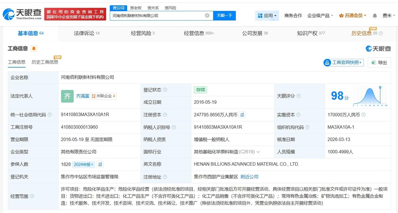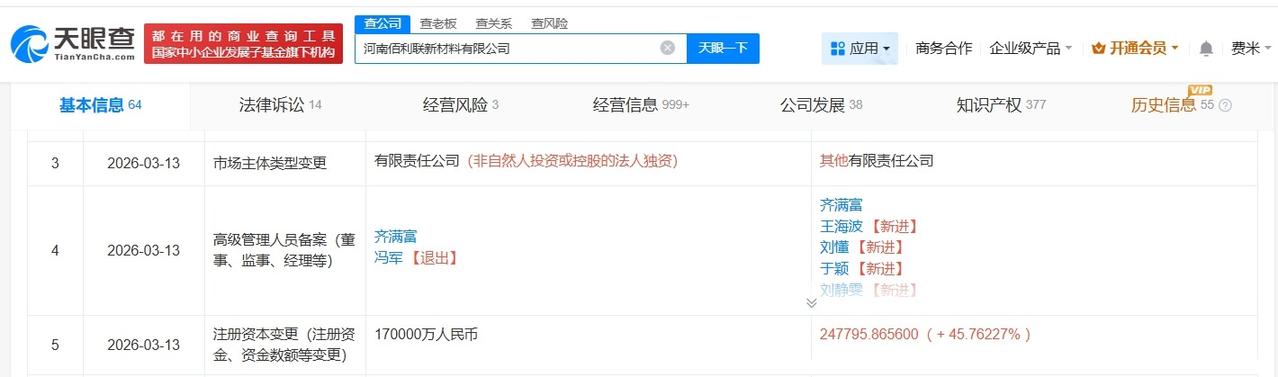 龙佰集团旗下佰利联新材料公司增资至24.8亿 增幅约46% 天眼查App显示,