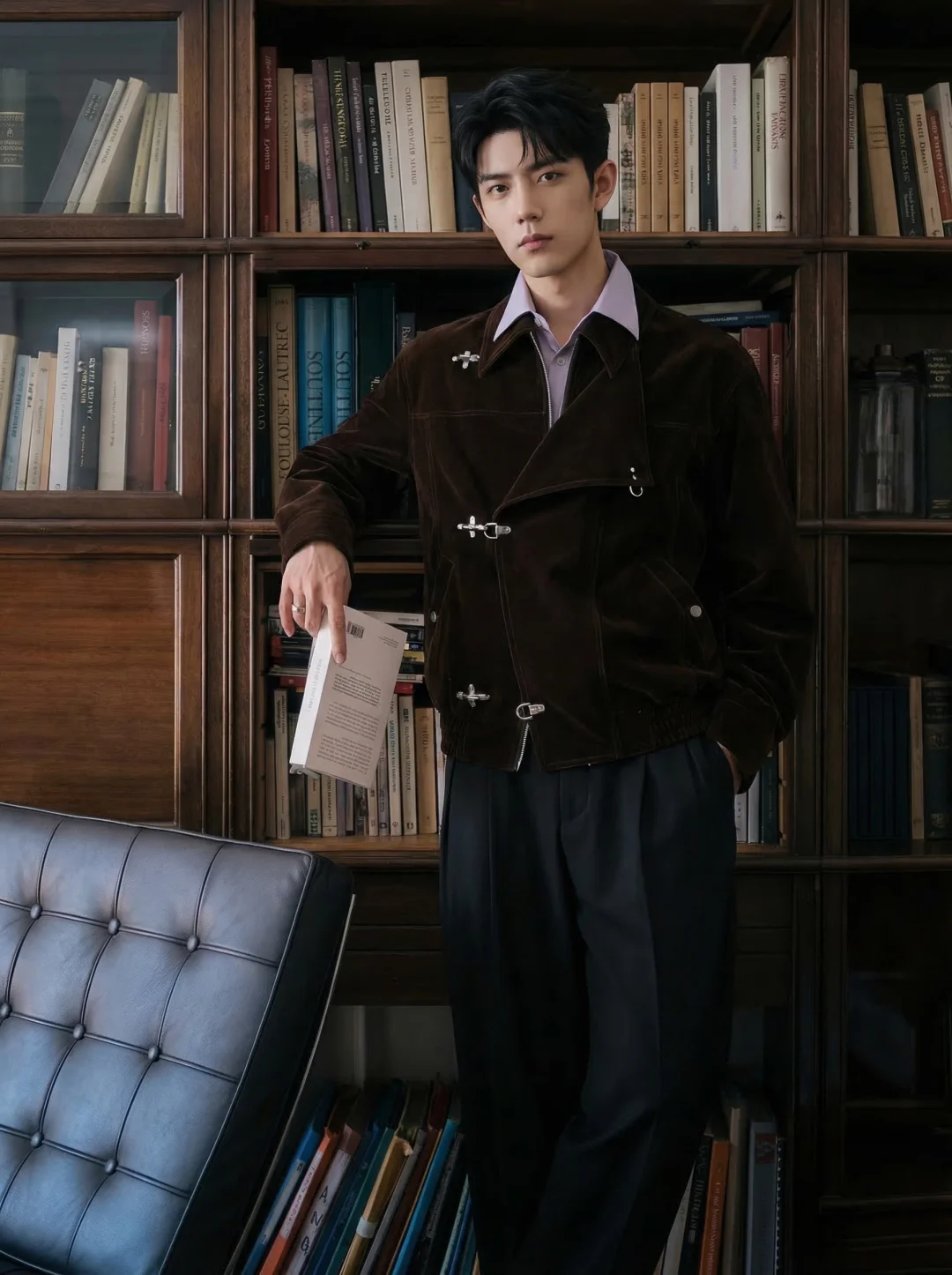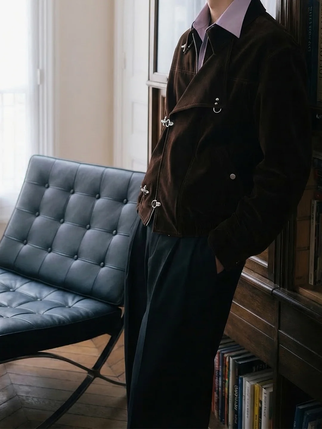 总觉得衣柜里差一件“有调性显贵”的单品?飞机扣天鹅绒夹克,直接把早春的质感拉满了。 很多人担心天鹅绒显老气,其实关键在于色彩的调和。低饱和度的紫色衬衫中和了咖色的沉闷,领口微敞露出层次,这种“冷暖交替”的视觉感,透着一股不费力的书卷气。 这套Look很适合坐在落地窗前的书店,或是午后安静的Gallery。 不需要多余的修饰高智雅痞感 ✨ 戳左下角,Get同款高智氛围感!