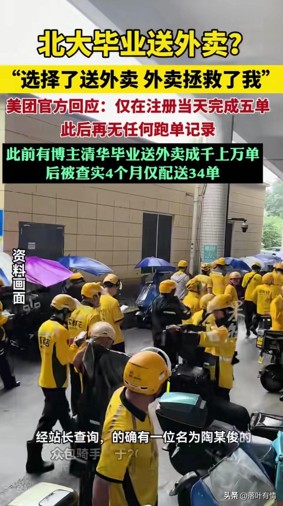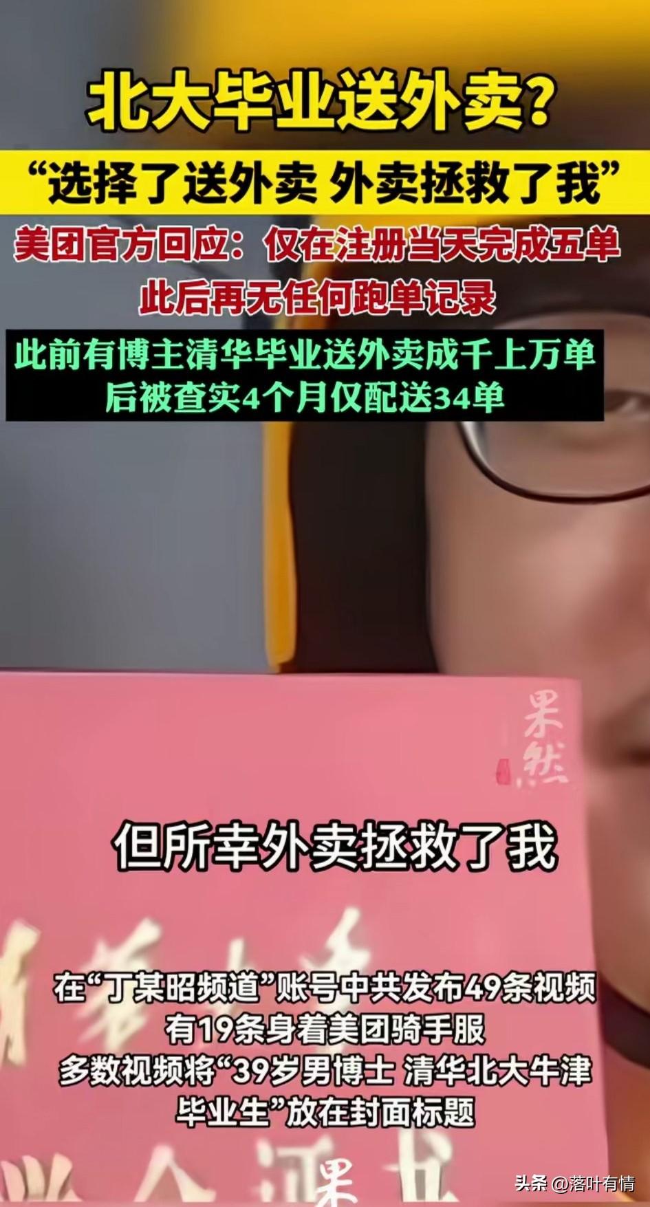 北大毕业送外卖? 近日冲上了热搜, 现在的自媒体真的太没有道德底线, 这个丁某昭发布了49条视频, 有19条,身穿美团骑手服, 多次将39岁清华北大牛津毕业生贴在封面标签上, 想要通过以此博取眼球, 搞得大家以为北大毕业真的要送外卖, 美团官方出面澄清了, 说他注册的是众包骑手, 注册当天仅完成了5单, 此后再无任何跑单记录, 说白了就是冲着做自媒体去的, 想要通过这样获取粉丝, 人家美团第一时间就去站点核实了, 所以大家不要再被这些自媒体误导了, 好好上学,考上985 211, 在如今这个年代还是有机会逆袭的, 穷人就更应该好好上学, 通过高考实现命运改变, 即便是成为小镇做题家, 至少跑赢了99%的普通人, 毕竟小镇做题家也会找到好工作, 努力就有收获, 懒惰就会贫穷 , 老话说的真的没有错! 北京 为什么很多清华北大毕业生去了美国 大学生干外卖 外卖员停车事件