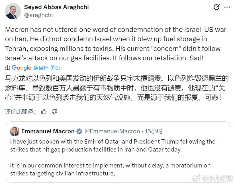 伊朗外长阿拉格奇:马克龙对以色列和美国发动的伊朗战争只字未提谴责。以色列炸毁德黑兰的燃料库,导致数百万人暴露于有毒物质中时,他也没有谴责。他现在的“关心”并非源于以色列袭击我们的天然气设施,而是源于我们的报复。可悲!美伊以冲突中方对以方说法感到震惊伊朗要求阿联酋作出赔偿黄媒不会说的真相