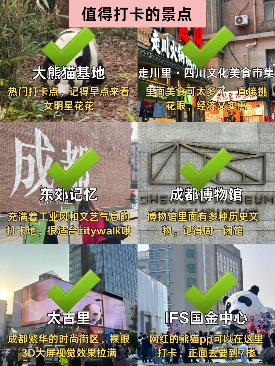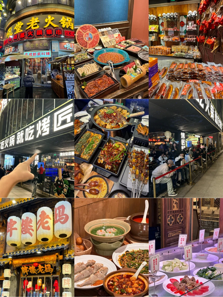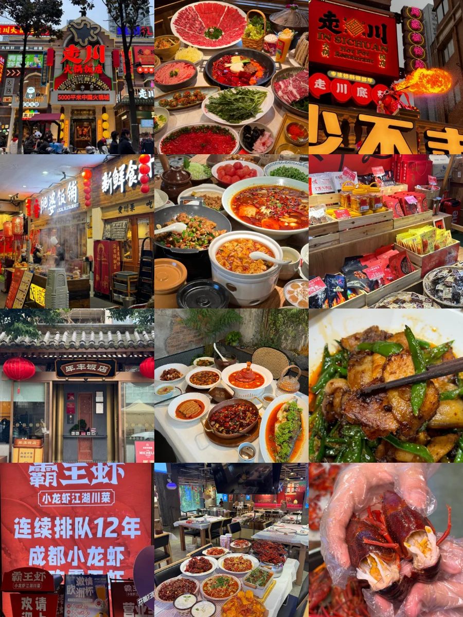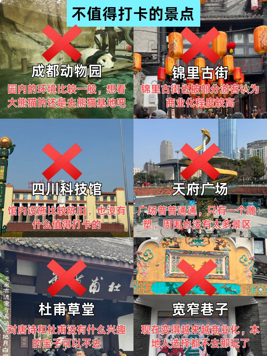 说走就走的旅行可能不太适合成都旅游❌不做攻略分分钟踩坑,这篇新鲜出炉的成都避🕳️指南快收好,哪些景点不值得去、哪些必打卡都列明白了,看完立省一半冤枉钱!! - 🥢成都美食 年丰饭店·川菜 霸王虾·小龙虾江湖川菜 烤匠麻辣烤鱼(春熙路店) 吼堂老火锅(太古里总店) 牌楼老妈饭店·老手艺川菜 走川火锅饭店·中国火锅城 香肥婆饭铺·川式现炒(太古里店)