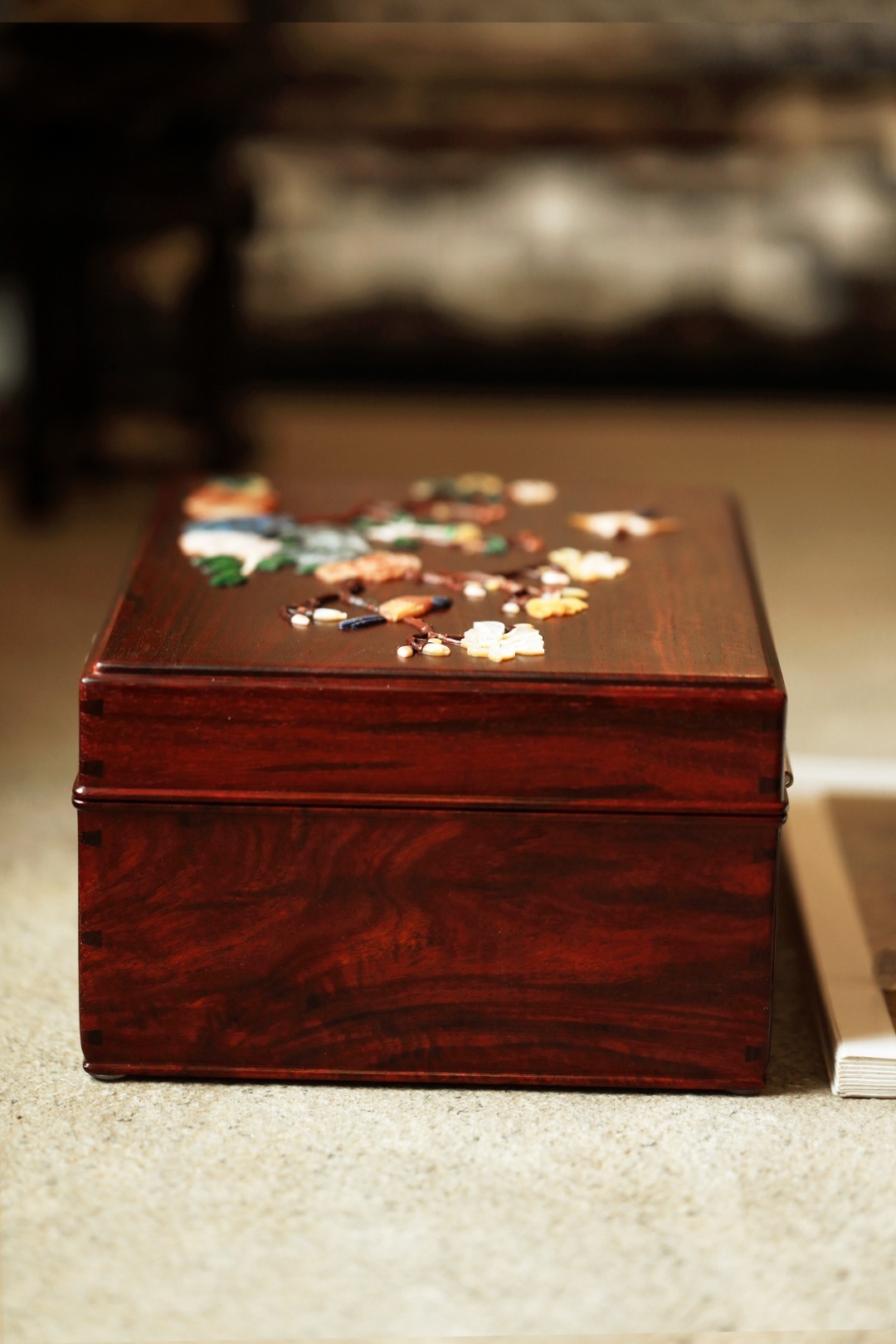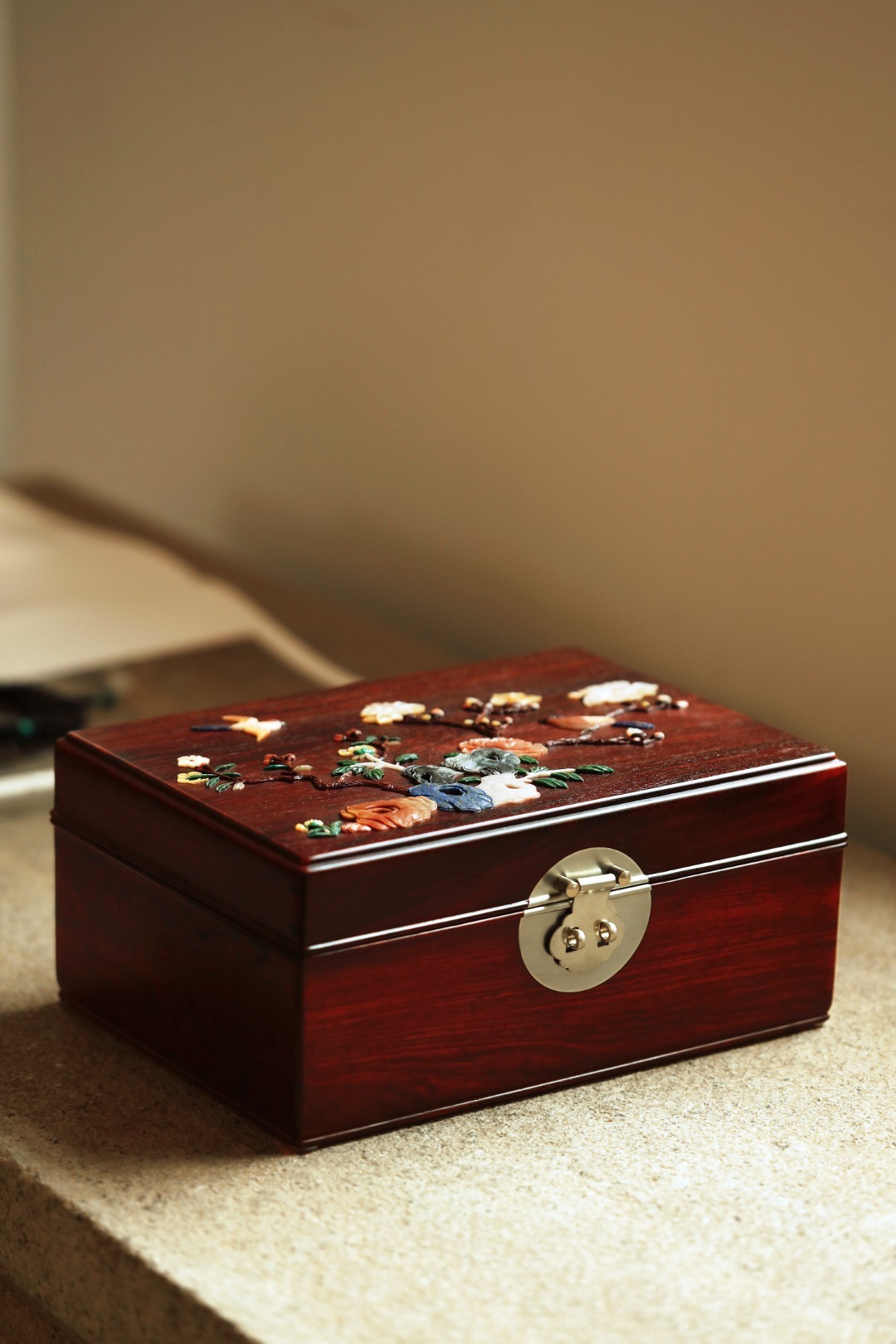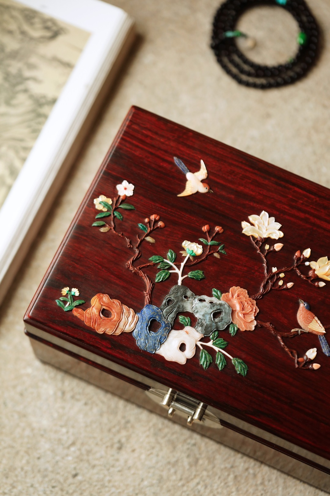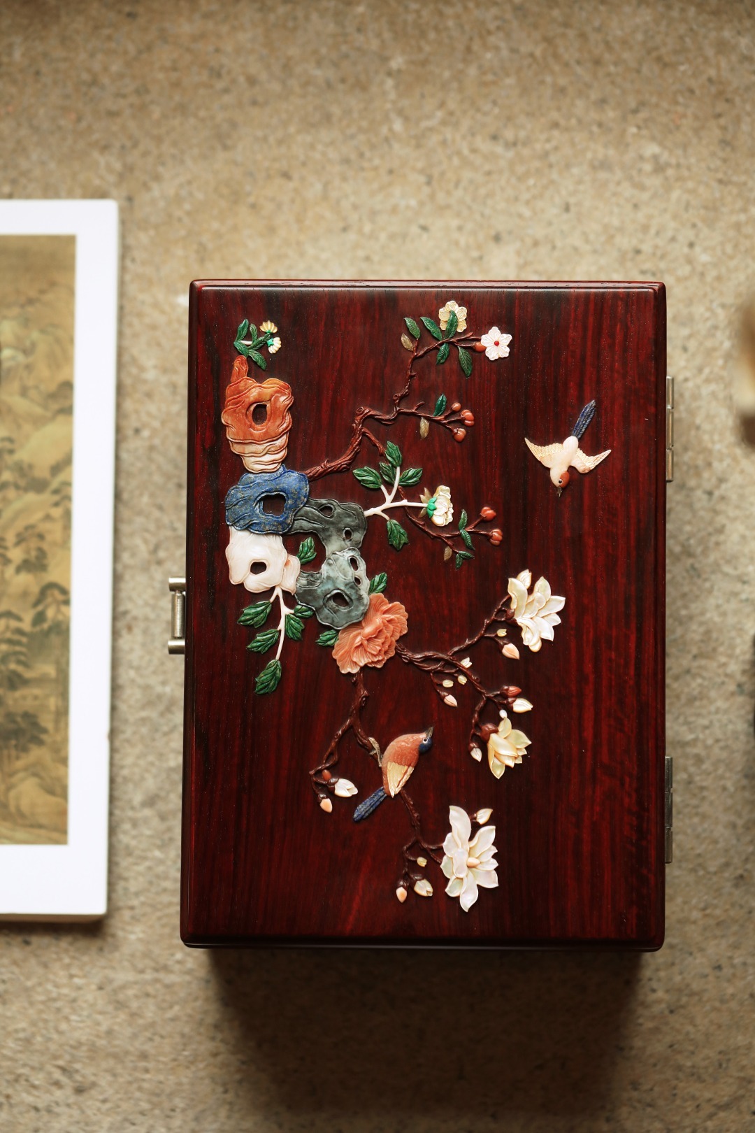 小叶紫檀独板老料制,全独板榫卯结构,百宝嵌花鸟图案,琢刻精细,色彩明丽,可纳章石珍宝,文雅秀丽。国风嫁妆之礼~