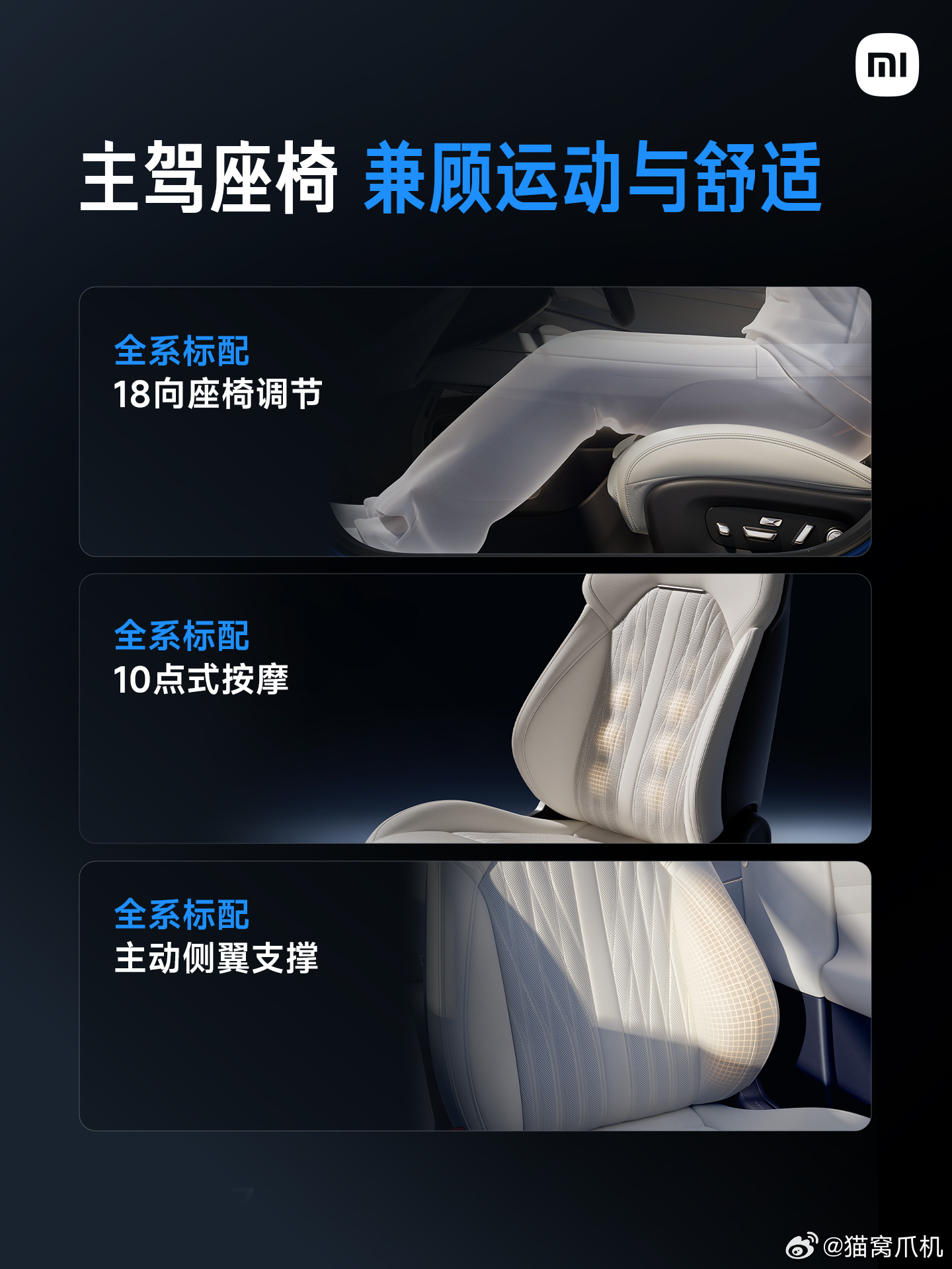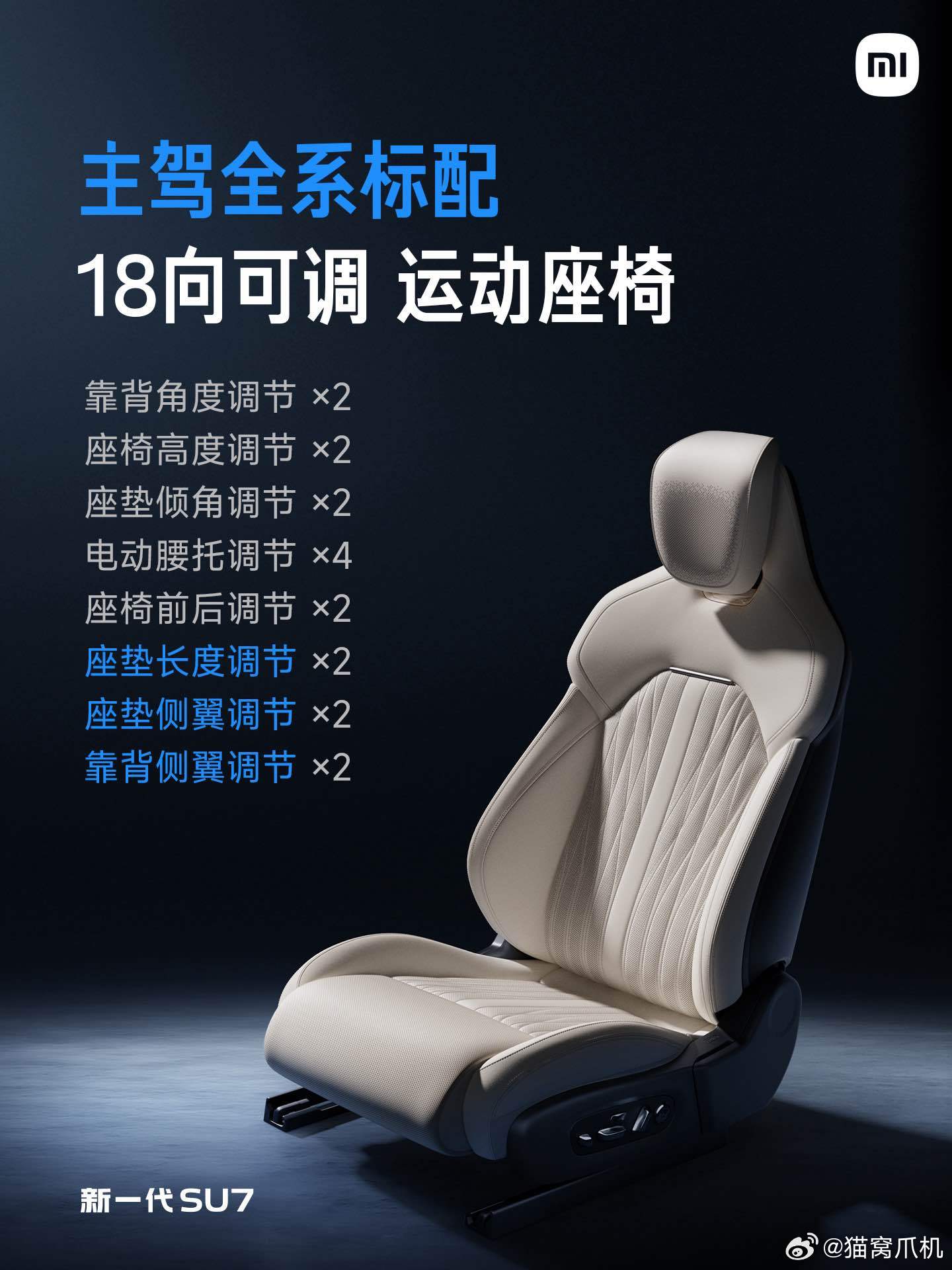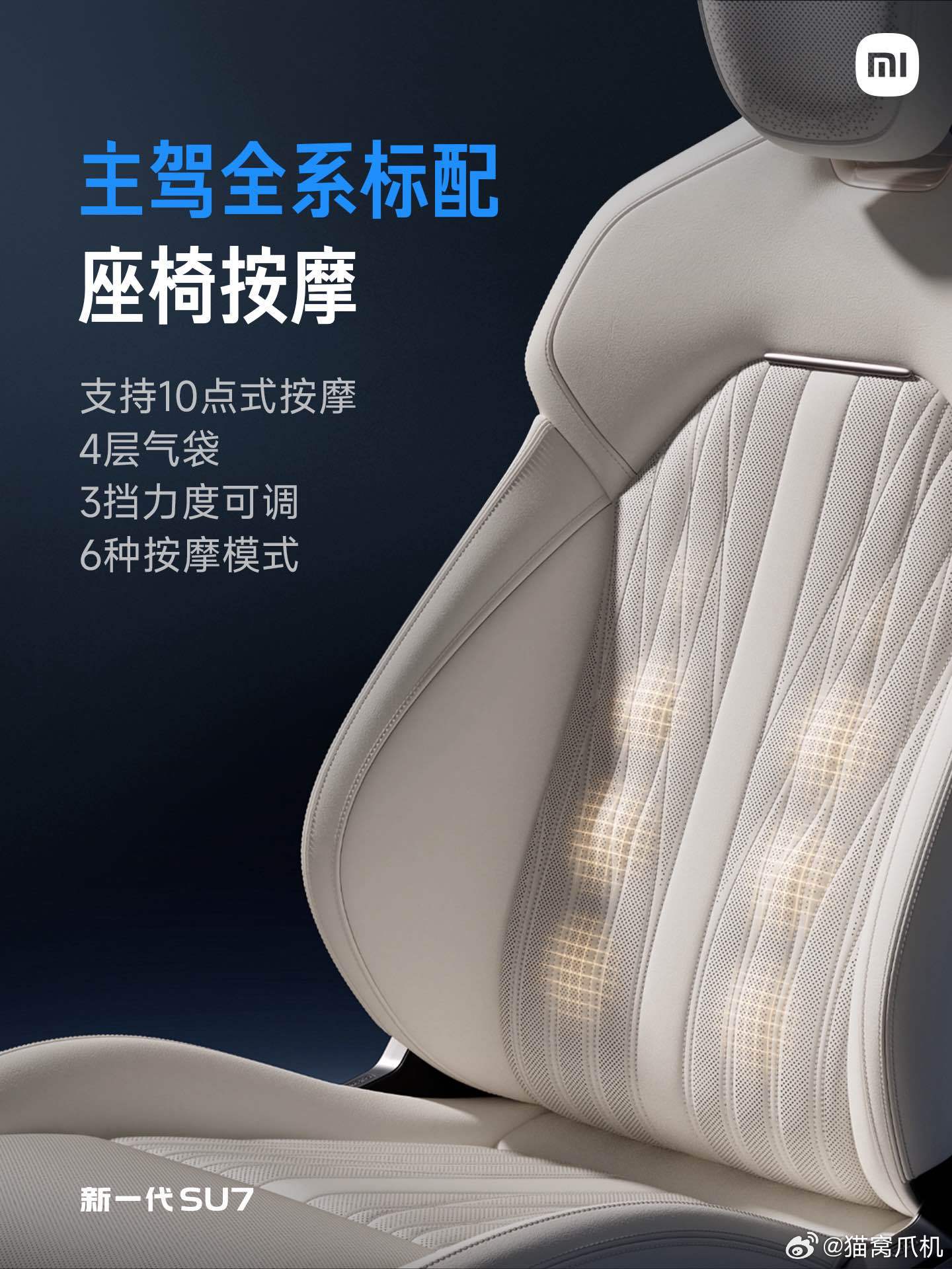 新一代小米SU7座椅全面升级,主驾18向调节+主动侧翼支撑,过弯更稳;10点式按摩缓解长途疲惫。副驾零重力躺卧+四向腿托,头等舱体验拉满。后排座垫增厚、角度优化,搭配睡眠头枕,久坐也舒适。从驾驶到乘坐,每一处都为舒适量身打造,质感与实用性兼备。新一代su7