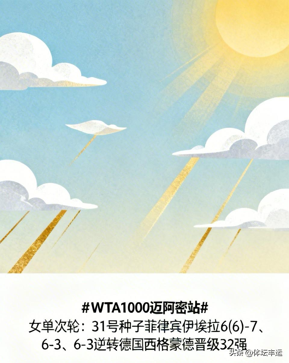 快讯,女单次轮比赛,31号种子菲律宾伊埃拉6(6)-7、6-3、6-3逆转德国西格蒙德率先晋级女单32强🔥 WTA单打排名