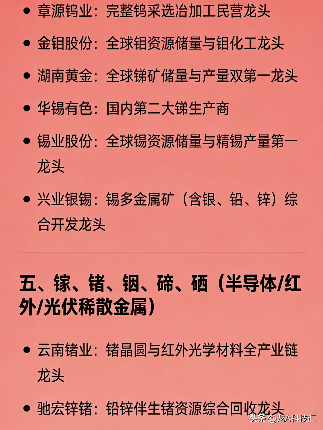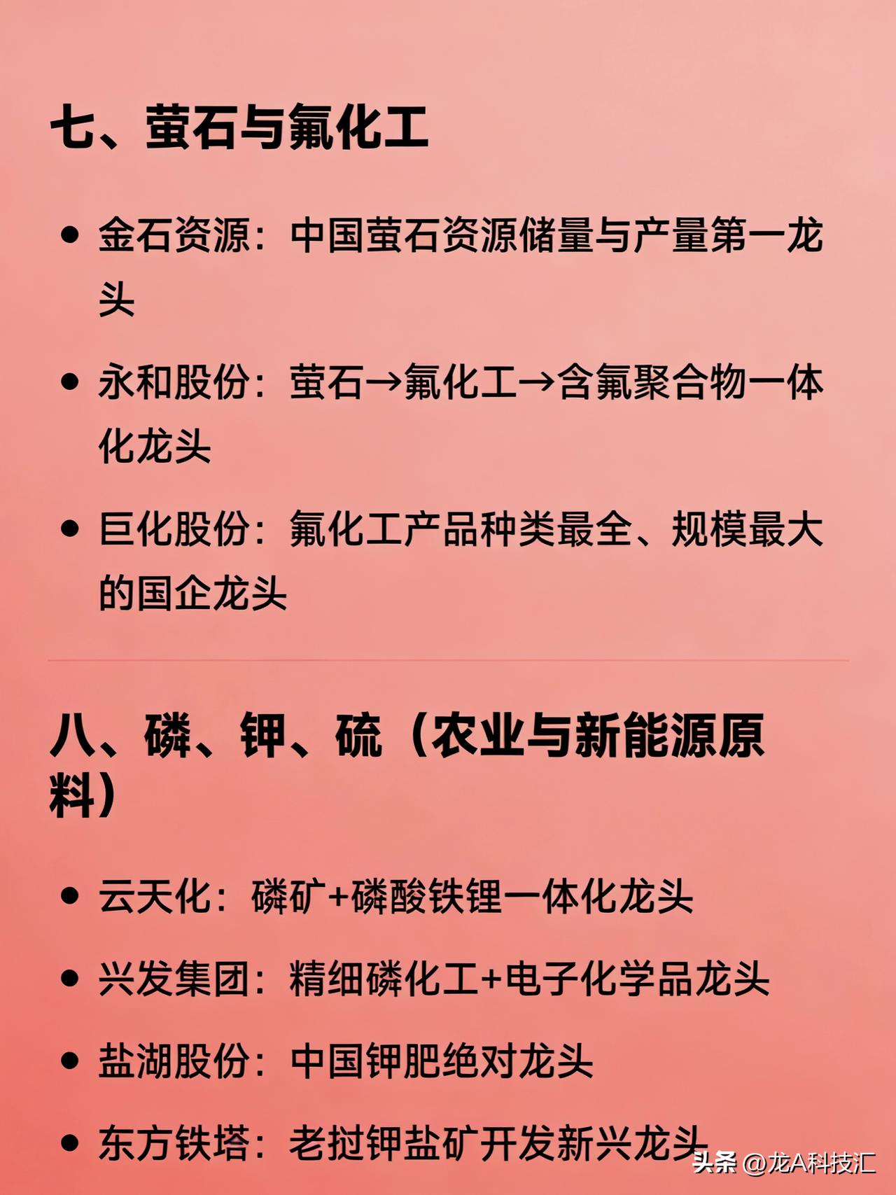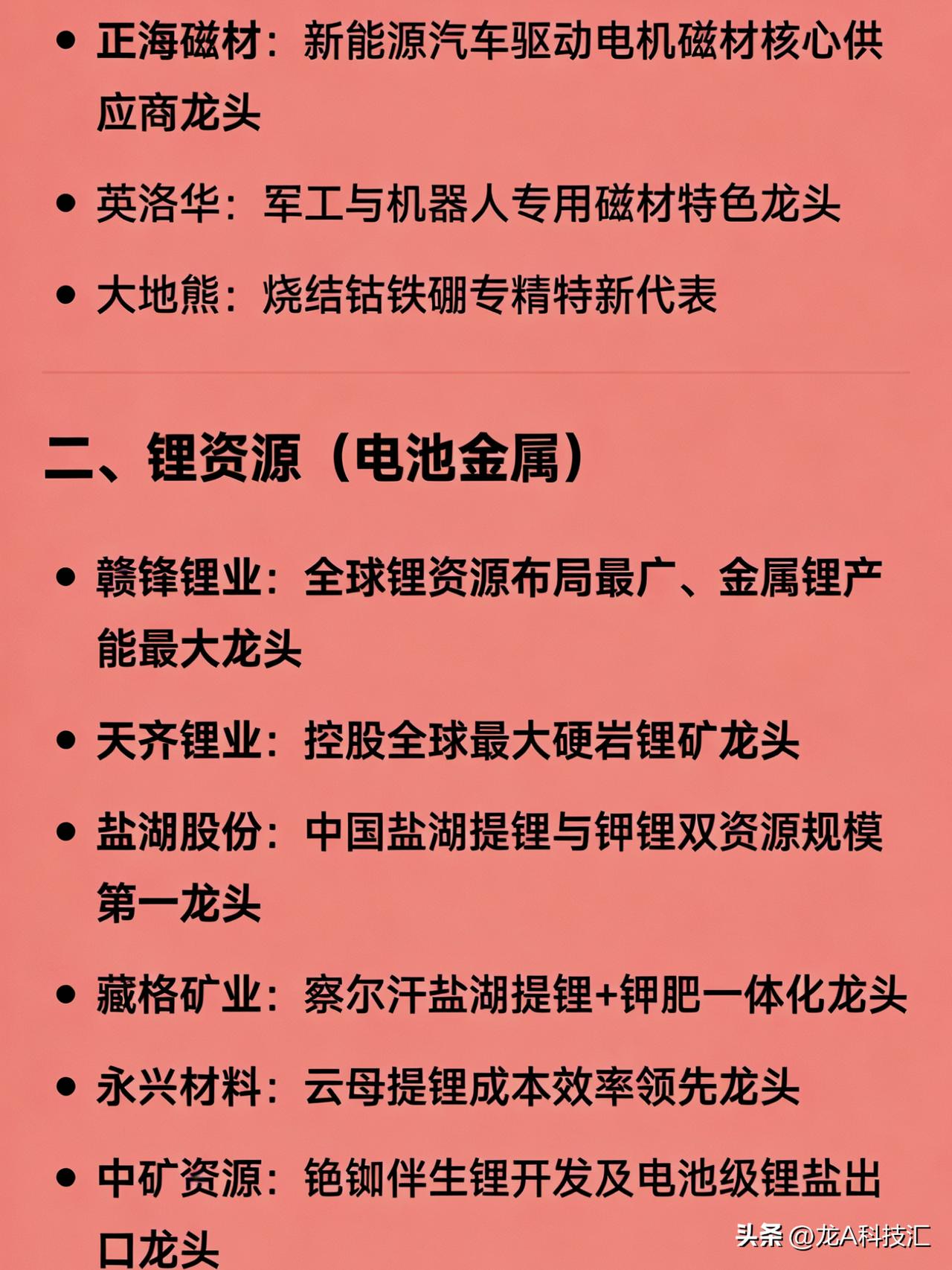 战略资源领域核心龙头企业全汇总(①) 一、稀土与永磁材料 北方稀土:全球轻稀土资源储量及冶炼分离的龙头企业 中国稀土:国家中重稀土整合平台的龙头 盛和资源:以海外稀土资源与国内配额双轮驱动的龙头 金力永磁:高性能钕铁硼磁材出货量位居全球第一 中科三环:技术最为全面、历史最为悠久的稀土永磁龙头 宁波韵升:高端伺服电机用磁材的龙头 正海磁材:新能源汽车驱动电机磁材的核心供应商龙头 英洛华:军工与机器人专用磁材的特色龙头 大地熊:烧结钕铁硼专精特新的代表 二、锂资源(电池金属) 赣锋锂业:全球锂资源布局最广、金属锂产能最大的龙头 天齐锂业:控股全球最大硬岩锂矿的龙头 盐湖股份:中国盐湖提锂与钾锂双资源规模居首的龙头 藏格矿业:察尔汗盐湖提锂与钾肥一体化的龙头 永兴材料:云母提锂成本效率领先的龙头 中矿资源:铯铷伴生锂开发及电池级锂盐出口的龙头 盛新锂能:自有锂矿与海外锂盐一体化布局的龙头 融捷股份:甲基卡锂矿资源持有的龙头 三、钴、镍、铜等关键金属 洛阳钼业:全球前二的钴生产商、世界级铜钴矿龙头 华友钴业:非洲钴资源与三元前驱体一体化的龙头 格林美:全球最大的钴镍废料回收与再生利用龙头 腾远钴业:高纯钴产品出口导向型龙头 中伟股份:三元前驱体全球市场占有率第一 兴业矿业:银漫多金属矿(含铜、锡、锌、银)综合开发龙头 四、钨、钼、锑、锡(硬质合金与阻燃/焊料金属) 厦门钨业:以完整钨产业链、稀土、能源材料三轮驱动的龙头 中钨高新:数控刀具与硬质合金制品的国家队龙头 章源钨业:完整钨采选冶加工的民营龙头 金钼股份:全球钼资源储量与钼化工龙头 湖南黄金:全球锑矿储量与产量均居第一的龙头 华锡有色:国内第二大锑生产商 锡业股份:全球锡资源储量与精锡产量第一的龙头 兴业银锡:锡多金属矿(含银、铅、锌)综合开发龙头 五、镓、锗、铟、碲、硒(半导体/红外/光伏稀散金属) 云南锗业:锗晶圆与红外光学材料全产业链龙头 驰宏锌锗:铅锌伴生锗资源综合回收龙头 蓝晓科技:吸附法提镓技术全球领先 中金岭南:全球铟资源储量第一 株冶集团:高纯铟、碲、硒综合回收龙头 豫光金铅:再生铅伴生稀散金属回收龙头 六、高纯石英砂与石英材料 石英股份:全球唯一具备大规模高纯石英砂量产能力的龙头 菲利华:半导体石英器件国产替代的核心龙头 凯德石英:半导体用石英制品专精特新龙头 七、萤石与氟化工 金石资源:中国萤石资源储量与产量第一的龙头 永和股份:萤石至氟化工再到含氟聚合物一体化的龙头 巨化股份:氟化工产品种类最全、规模最大的国企龙头 八、磷、钾、硫(农业与新能源原料) 云天化:磷矿与磷酸铁锂一体化的龙头 兴发集团:精细磷化工与电子化学品龙头 盐湖股份:中国钾肥的绝对龙头 东方铁塔:老挝钾盐矿开发的新兴龙头 芭田股份:贵州磷矿资源整合的推进者 九、铀资源(核能战略资源) 中核钛白:布局铀资源开发的潜在龙头 盛和资源:参与海外铀矿投资 十、军工基础材料 北化股份:全球唯一的全系列硝化棉生产企业 泰和新材:国内芳纶(对位+间位)双料龙头 中简科技 / 光威复材 / 中复神鹰:高性能碳纤维军用/民用龙头 十一、铂族金属 贵研铂业:中国铂族金属资源回收与新材料龙头 十二、锆、铪等特种金属 东方锆业:氯氧化锆、电熔锆全产业链龙头 三祥新材:电熔氧化锆与纳米锆材料龙头