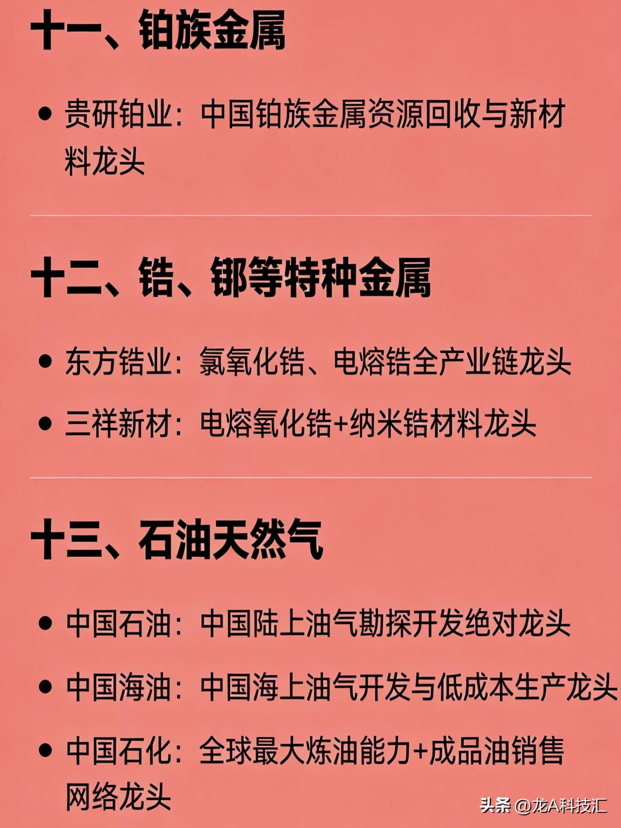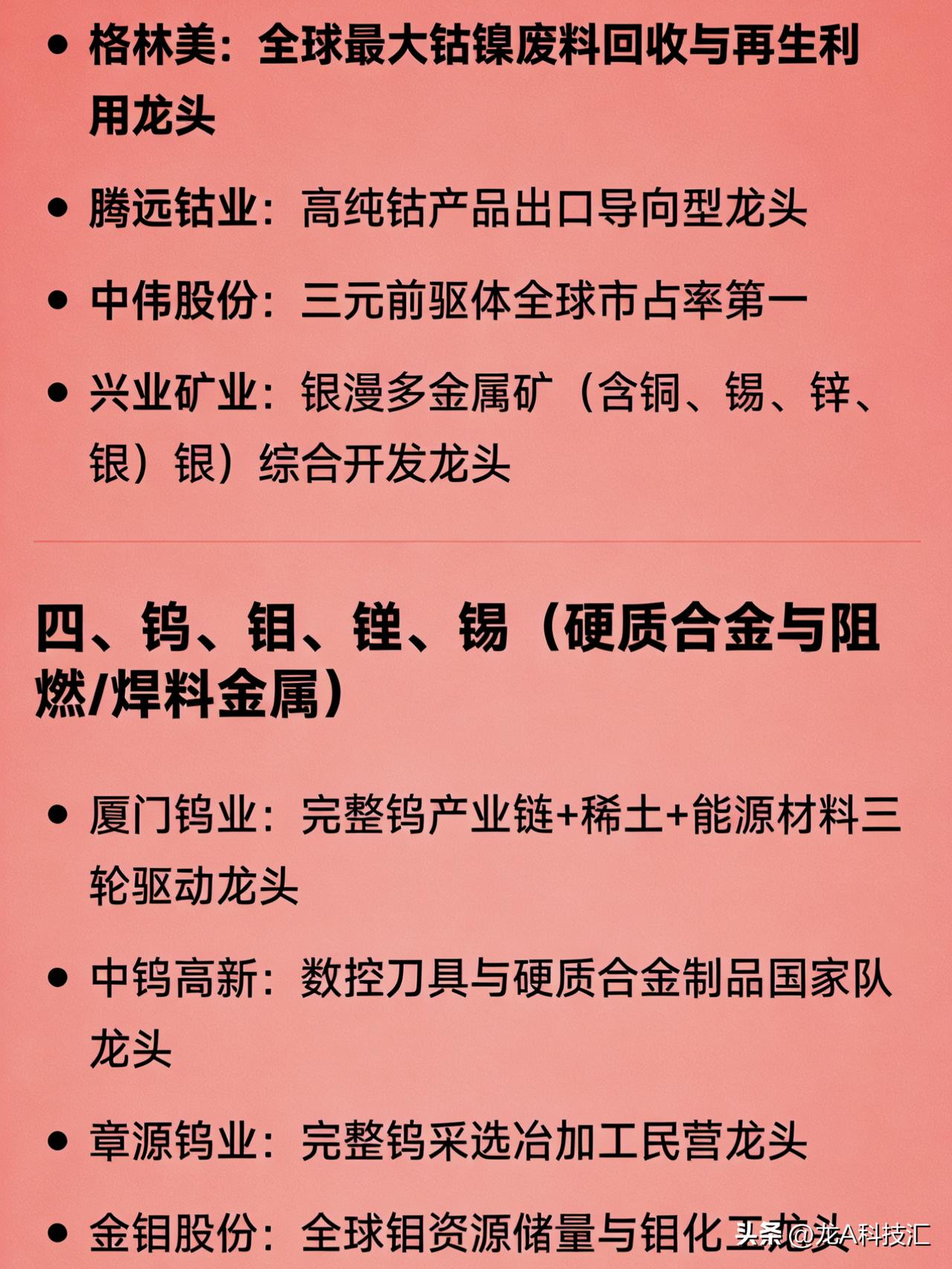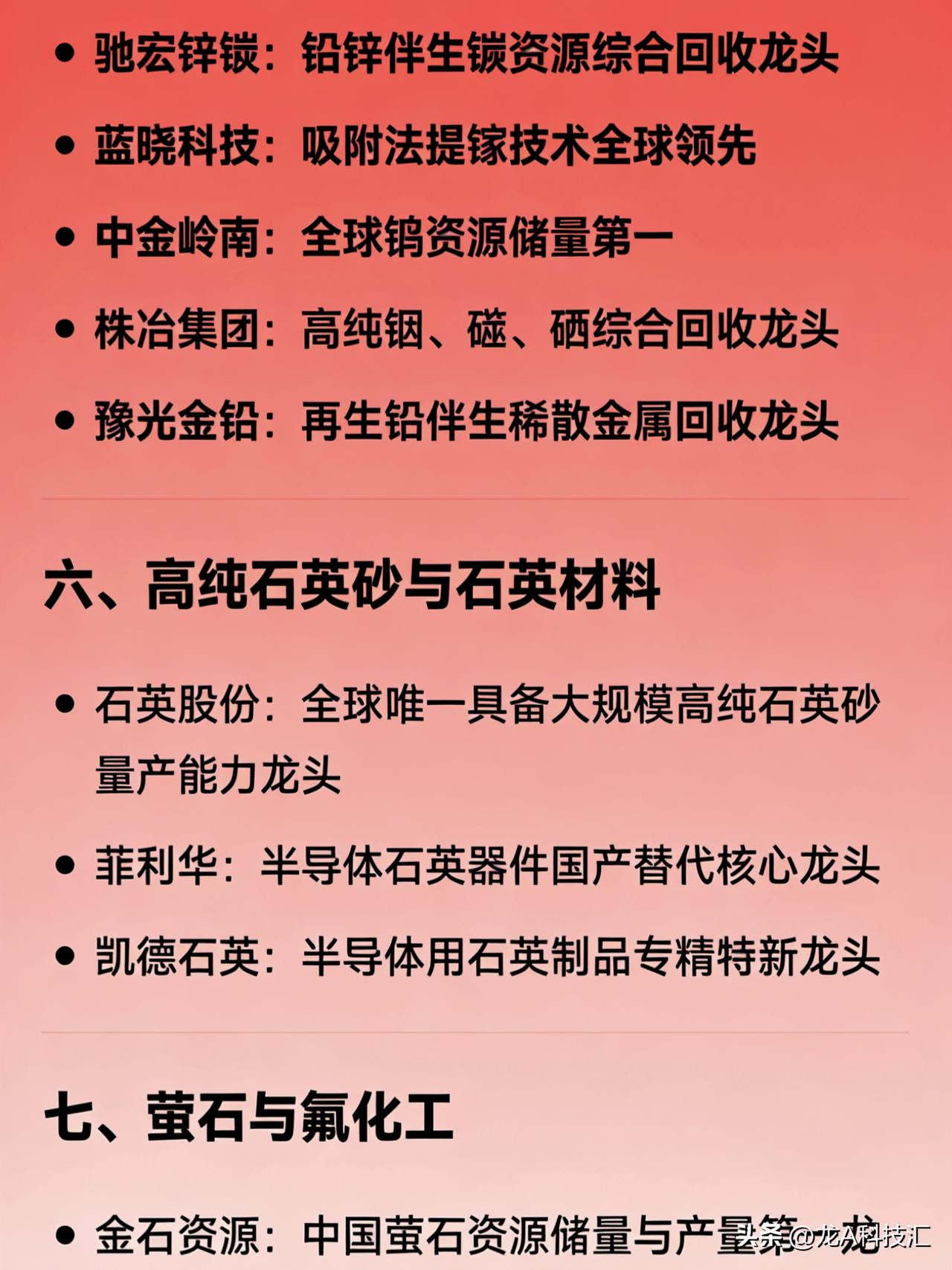 战略资源领域核心龙头企业全汇总(①) 一、稀土与永磁材料 北方稀土:全球轻稀土资源储量及冶炼分离的龙头企业 中国稀土:国家中重稀土整合平台的龙头 盛和资源:以海外稀土资源与国内配额双轮驱动的龙头 金力永磁:高性能钕铁硼磁材出货量位居全球第一 中科三环:技术最为全面、历史最为悠久的稀土永磁龙头 宁波韵升:高端伺服电机用磁材的龙头 正海磁材:新能源汽车驱动电机磁材的核心供应商龙头 英洛华:军工与机器人专用磁材的特色龙头 大地熊:烧结钕铁硼专精特新的代表 二、锂资源(电池金属) 赣锋锂业:全球锂资源布局最广、金属锂产能最大的龙头 天齐锂业:控股全球最大硬岩锂矿的龙头 盐湖股份:中国盐湖提锂与钾锂双资源规模居首的龙头 藏格矿业:察尔汗盐湖提锂与钾肥一体化的龙头 永兴材料:云母提锂成本效率领先的龙头 中矿资源:铯铷伴生锂开发及电池级锂盐出口的龙头 盛新锂能:自有锂矿与海外锂盐一体化布局的龙头 融捷股份:甲基卡锂矿资源持有的龙头 三、钴、镍、铜等关键金属 洛阳钼业:全球前二的钴生产商、世界级铜钴矿龙头 华友钴业:非洲钴资源与三元前驱体一体化的龙头 格林美:全球最大的钴镍废料回收与再生利用龙头 腾远钴业:高纯钴产品出口导向型龙头 中伟股份:三元前驱体全球市场占有率第一 兴业矿业:银漫多金属矿(含铜、锡、锌、银)综合开发龙头 四、钨、钼、锑、锡(硬质合金与阻燃/焊料金属) 厦门钨业:以完整钨产业链、稀土、能源材料三轮驱动的龙头 中钨高新:数控刀具与硬质合金制品的国家队龙头 章源钨业:完整钨采选冶加工的民营龙头 金钼股份:全球钼资源储量与钼化工龙头 湖南黄金:全球锑矿储量与产量均居第一的龙头 华锡有色:国内第二大锑生产商 锡业股份:全球锡资源储量与精锡产量第一的龙头 兴业银锡:锡多金属矿(含银、铅、锌)综合开发龙头 五、镓、锗、铟、碲、硒(半导体/红外/光伏稀散金属) 云南锗业:锗晶圆与红外光学材料全产业链龙头 驰宏锌锗:铅锌伴生锗资源综合回收龙头 蓝晓科技:吸附法提镓技术全球领先 中金岭南:全球铟资源储量第一 株冶集团:高纯铟、碲、硒综合回收龙头 豫光金铅:再生铅伴生稀散金属回收龙头 六、高纯石英砂与石英材料 石英股份:全球唯一具备大规模高纯石英砂量产能力的龙头 菲利华:半导体石英器件国产替代的核心龙头 凯德石英:半导体用石英制品专精特新龙头 七、萤石与氟化工 金石资源:中国萤石资源储量与产量第一的龙头 永和股份:萤石至氟化工再到含氟聚合物一体化的龙头 巨化股份:氟化工产品种类最全、规模最大的国企龙头 八、磷、钾、硫(农业与新能源原料) 云天化:磷矿与磷酸铁锂一体化的龙头 兴发集团:精细磷化工与电子化学品龙头 盐湖股份:中国钾肥的绝对龙头 东方铁塔:老挝钾盐矿开发的新兴龙头 芭田股份:贵州磷矿资源整合的推进者 九、铀资源(核能战略资源) 中核钛白:布局铀资源开发的潜在龙头 盛和资源:参与海外铀矿投资 十、军工基础材料 北化股份:全球唯一的全系列硝化棉生产企业 泰和新材:国内芳纶(对位+间位)双料龙头 中简科技 / 光威复材 / 中复神鹰:高性能碳纤维军用/民用龙头 十一、铂族金属 贵研铂业:中国铂族金属资源回收与新材料龙头 十二、锆、铪等特种金属 东方锆业:氯氧化锆、电熔锆全产业链龙头 三祥新材:电熔氧化锆与纳米锆材料龙头