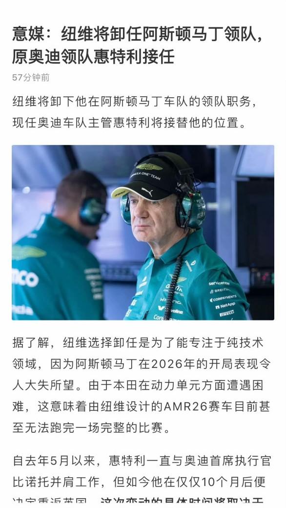 再见,纽维!阿德里安·纽维将不再担任阿斯顿·马丁领队,将专注于技术方面。 纽维不再担任领队是早就预料到的,毕竟专业的人干专业的事。但惠特利好好的奥迪领队不做,去现在水深火热的阿斯顿马丁就搞不懂了。现在奥迪还有点起色,但阿斯顿马丁的问题真的严重多了。 马丁车队2026赛季开局的技术灾难和职位变动成为焦点,其传奇设计师生涯正面临前所未有的管理挑战。