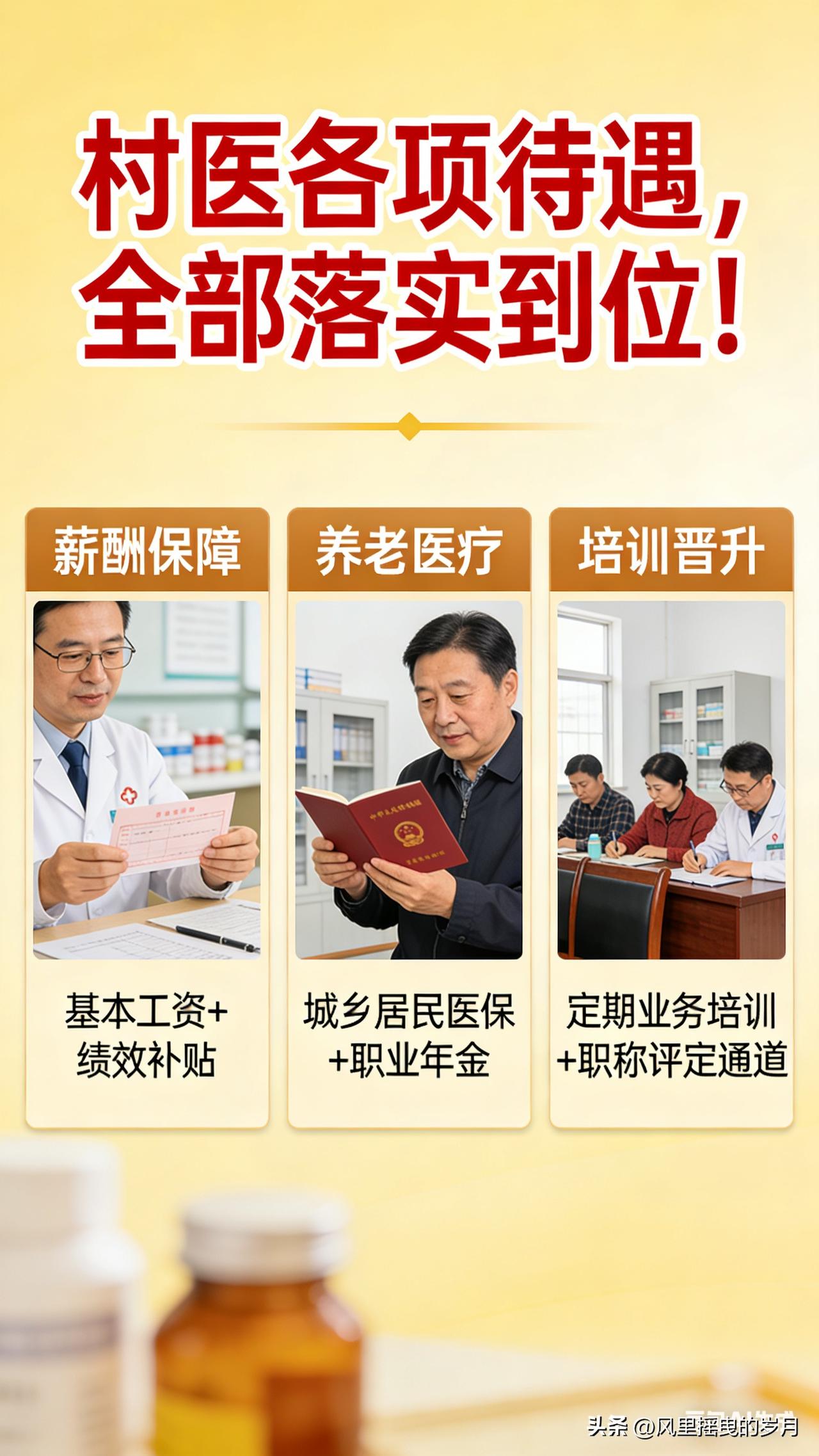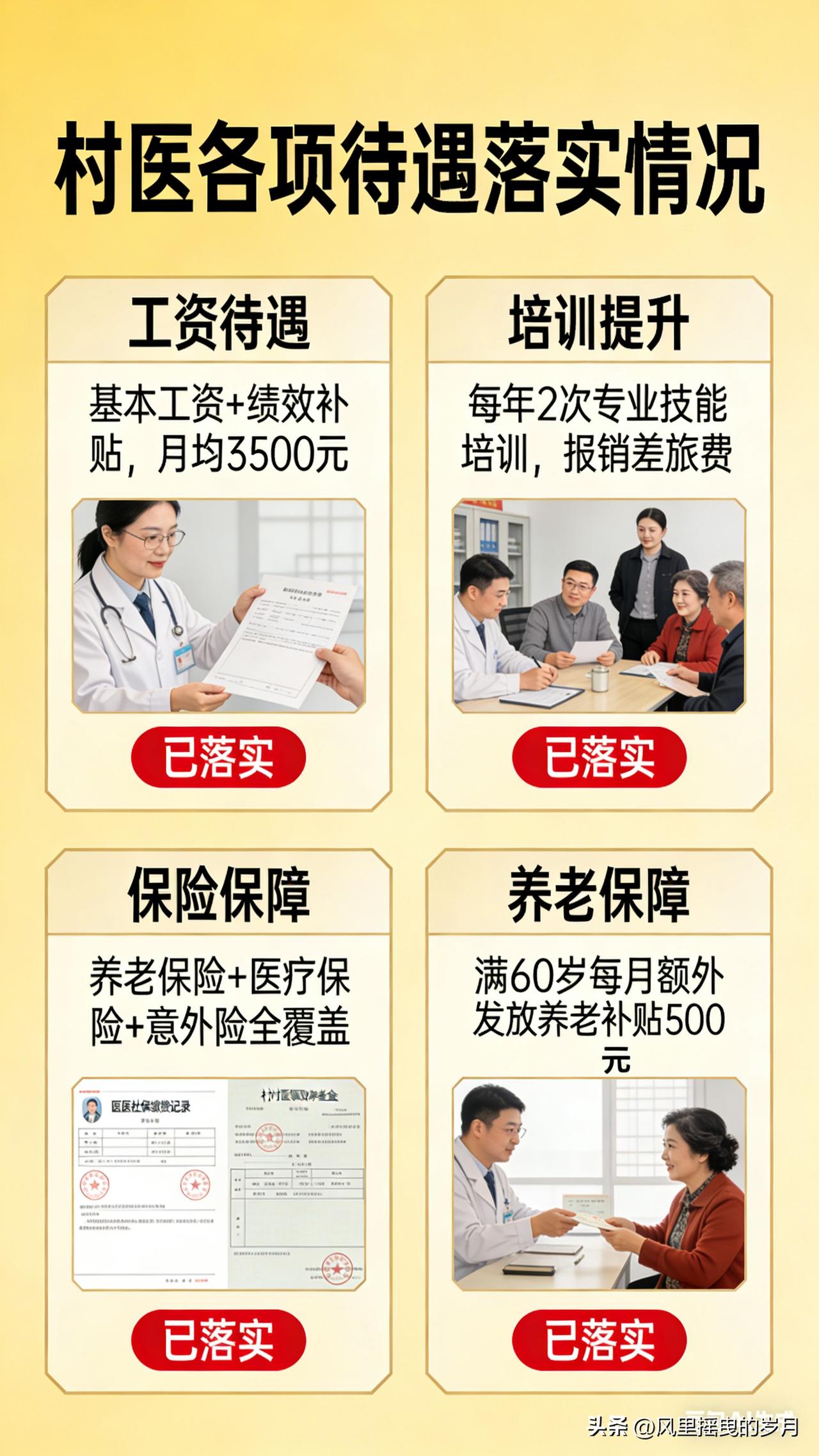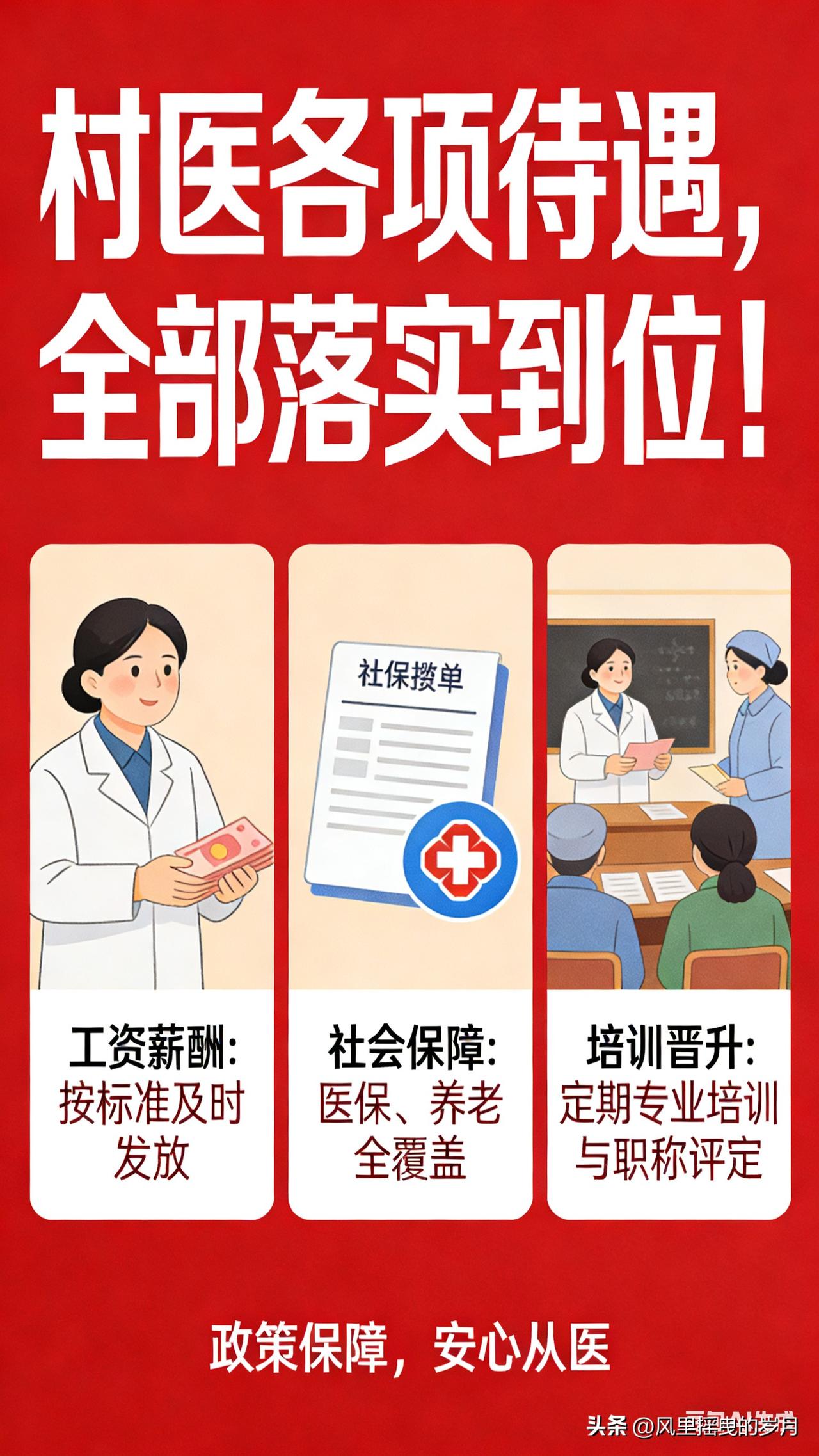 已为你生成文档 村医各项待遇,全部落实到位! 扎根乡土,守护万家灯火;悬壶济世,筑牢健康防线。长期以来,千万乡村医生奔走在田间地头、村落街巷,用脚步丈量责任,用坚守诠释担当,成为基层医疗的“网底卫士”。如今,随着国家政策的持续发力与地方落实的不断提速,村医各项待遇已全面落地、足额兑现,从收入保障到养老兜底,从社保覆盖到职业激励,全方位、无死角的待遇体系,让村医在岗有底气、退休有依靠、发展有奔头。 收入保障:多维度补贴直达,收入稳步提升 告别“收入不稳定、补贴难兑现”的困境,当前村医收入已形成“基础补助+绩效奖励+专项补贴”的多元体系,每一笔资金都直达个人账户、按月足额发放,彻底杜绝拖欠、截留问题。 基础补助足额到位:基本公共卫生服务补助、基本药物制度补助、一般诊疗费三大核心补贴全面落实,2025年基本公共卫生服务人均补助标准已提高至99元,且明确40%以上资金倾斜村级岗位 。基本药物“零差率”销售补助全额覆盖,一般诊疗费标准动态上调,偏远地区额外加码,让村医的基础收入有了坚实保障。 专项补贴精准发力:各地纷纷设立乡村医生岗位补助、工龄补助、偏远地区津贴,部分省份明确在岗村医月均收入不低于3000元,经济发达地区更是达到5000元以上。同时,年终考核奖励、家庭医生签约服务费等绩效收入同步落地,干得越好、收入越高,多劳多得、优绩优酬的导向清晰凸显。 运行成本全额兜底:村卫生室房屋维修、设备更新、水电耗材等日常运行经费,全部由财政承担,彻底免除村医的经营负担,让村医能全身心投入诊疗服务,无需为“柴米油盐”分心。 社保养老:分类保障全覆盖,晚年生活有尊严 “在岗有社保、退出有补助、晚年有保障”,这是国家对村医的郑重承诺,如今已全面落地生根,彻底解决村医的后顾之忧。 社保参保无死角:已纳入事业编制的村医,按规定参加机关事业单位养老保险;未入编村医,统一纳入企业职工基本养老保险或城乡居民养老保险,地方财政给予参保补贴 。同时,职工医保、城乡居民医保、人身意外险、医疗责任险等险种全面覆盖,让村医看病有保障、执业有安全。 养老补助阶梯兑现:年满60周岁的离岗村医,养老补助按服务年限分档发放,服务满10年、20年、30年的村医,补助标准逐级提升,部分地区每月补助高达2000元 。多地推行“工龄阶梯+高龄倾斜”模式,65岁以上、70岁以上离岗村医额外加发补贴,真正实现“干得越久、领得越多”。 离岗待遇只升不降:各地建立离岗村医养老补助动态调整机制,确保补助标准随经济发展同步提高,让奉献半生的老村医,晚年生活体面又安心。 职业发展:激励机制完善,成长空间广阔 待遇落实不仅是物质保障,更关乎职业尊严与发展前景,当前村医职业发展通道全面打通,激励体系持续完善。 编制与身份突破:“乡聘村用”“村医入编”政策全面推开,多地将优秀村医纳入事业编制管理,实现与乡镇卫生院同类人员同工同酬,基本工资、绩效奖金、福利补贴全部对标执行 。未入编村医也纳入一体化管理,享受同等培训、晋升、评优机会。 培训晋升常态化:定期组织村医参加技能培训、学历提升、职称评定,从全科医生津贴到等级评定奖励,全方位提升村医专业能力与职业价值 。同时,设立专项奖励基金,对表现突出的村医给予表彰奖励,增强职业荣誉感。 监管机制保落实:各地建立资金直达、专款专用、全程监管的保障机制,通过“一卡通”发放、定期公示、专项督查等方式,确保各项待遇政策不打折扣、落地见效。 从田间到案头,从青丝到白发,村医的坚守值得被看见、被善待。如今,各项待遇全面落实、精准兑现,不仅是对村医奉献的最好回馈,更将吸引更多人才扎根基层、服务乡村,让基层医疗网底更牢固、乡村健康防线更坚实,为乡村振兴注入源源不断的健康力量。