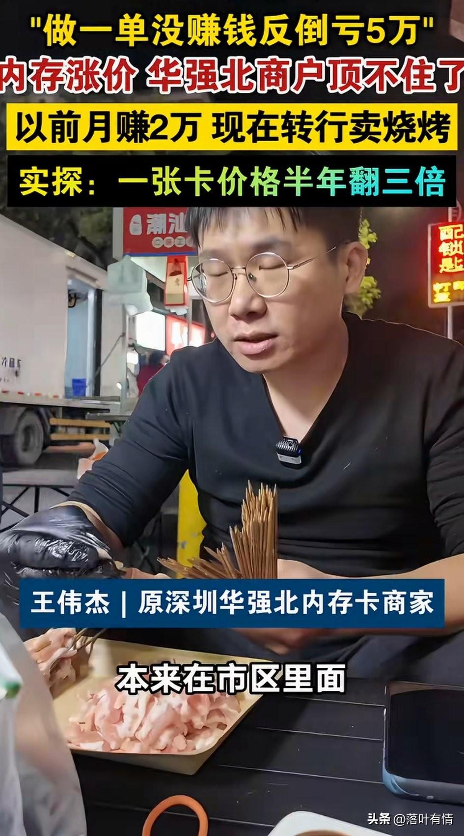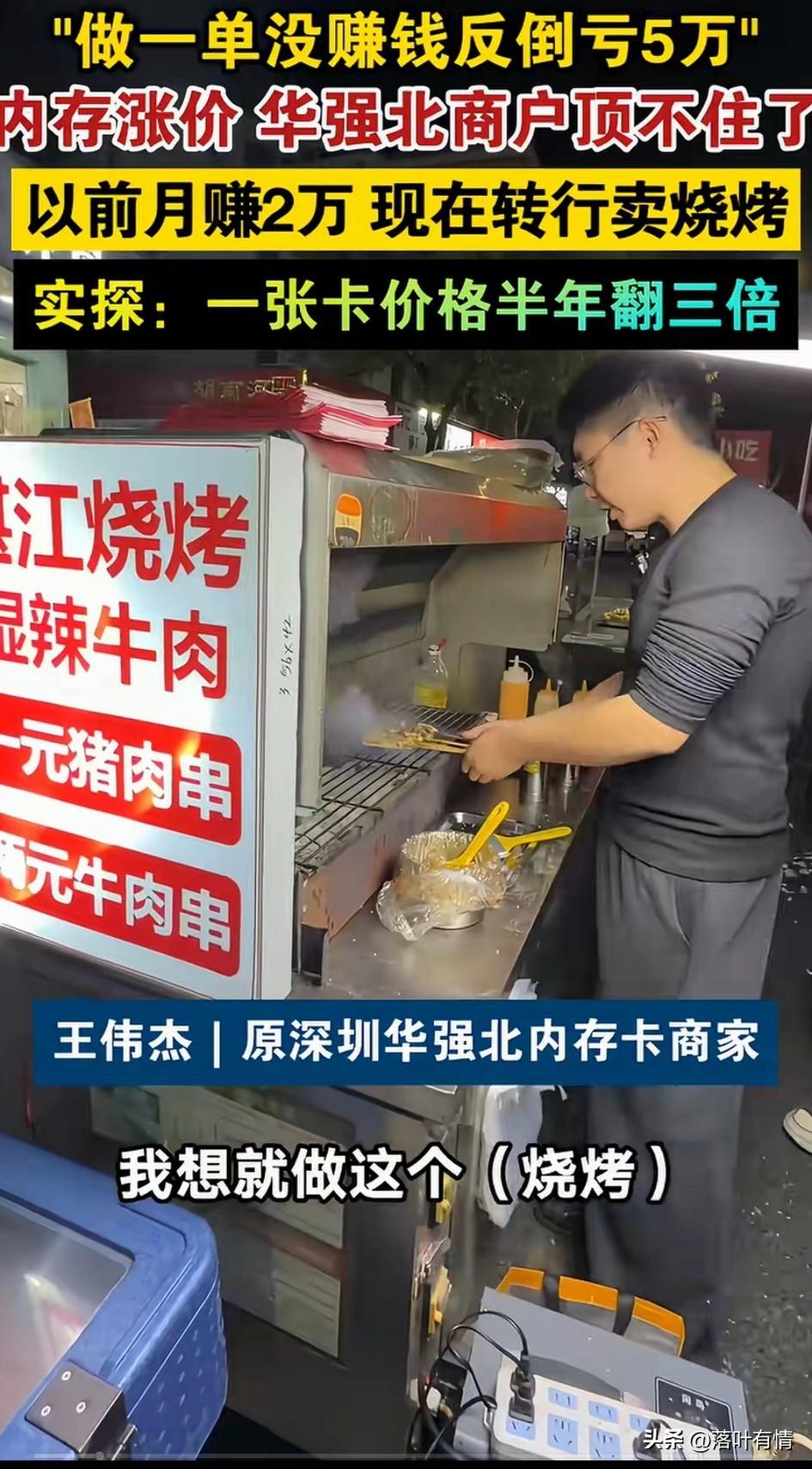 深圳华强北做内存卡的老板改行卖烧烤,问及原因,他表示这次内存卡涨价太快了,他有一个朋友, 一周前给下游报价70块钱一张, 刚报价完之后内存卡涨了, 直接涨到200块一张, 做了一单直接亏了5万, 他看到这个教训之后, 直接转行做了烧烤, 之前忙的时候一周就挣两三万, 感觉这一行非常轻松, 但没有想到现在黄金涨了之后, 内存卡居然也跟着上涨了, 都说今年三月份手机都要涨价, 就是因为内存卡涨价了, 没想到华强北早就做好了应对, 很多人转行做了电商或者其他行业, 这个老板也是转到了烧烤, 他说现在这个行业没法做了, 因为涨价太厉害, 一个月也没有一个单子, 差点要喝西北风, 还不如干点其他的, 如果内存卡持续涨价, 那么手机必然会涨价, 大家之后销量必然大跌, 毕竟大家的收入没有增长, 不会有人去换手机了, 很多网友也表示, 如果真的手机涨价了, 那么自己的手机要用两三年之后再说了,手机卖不出去, 涨价也没有用, 大家觉得呢? 内存芯片行情 内存条行情 内存条价格疯涨 内存条回收价格