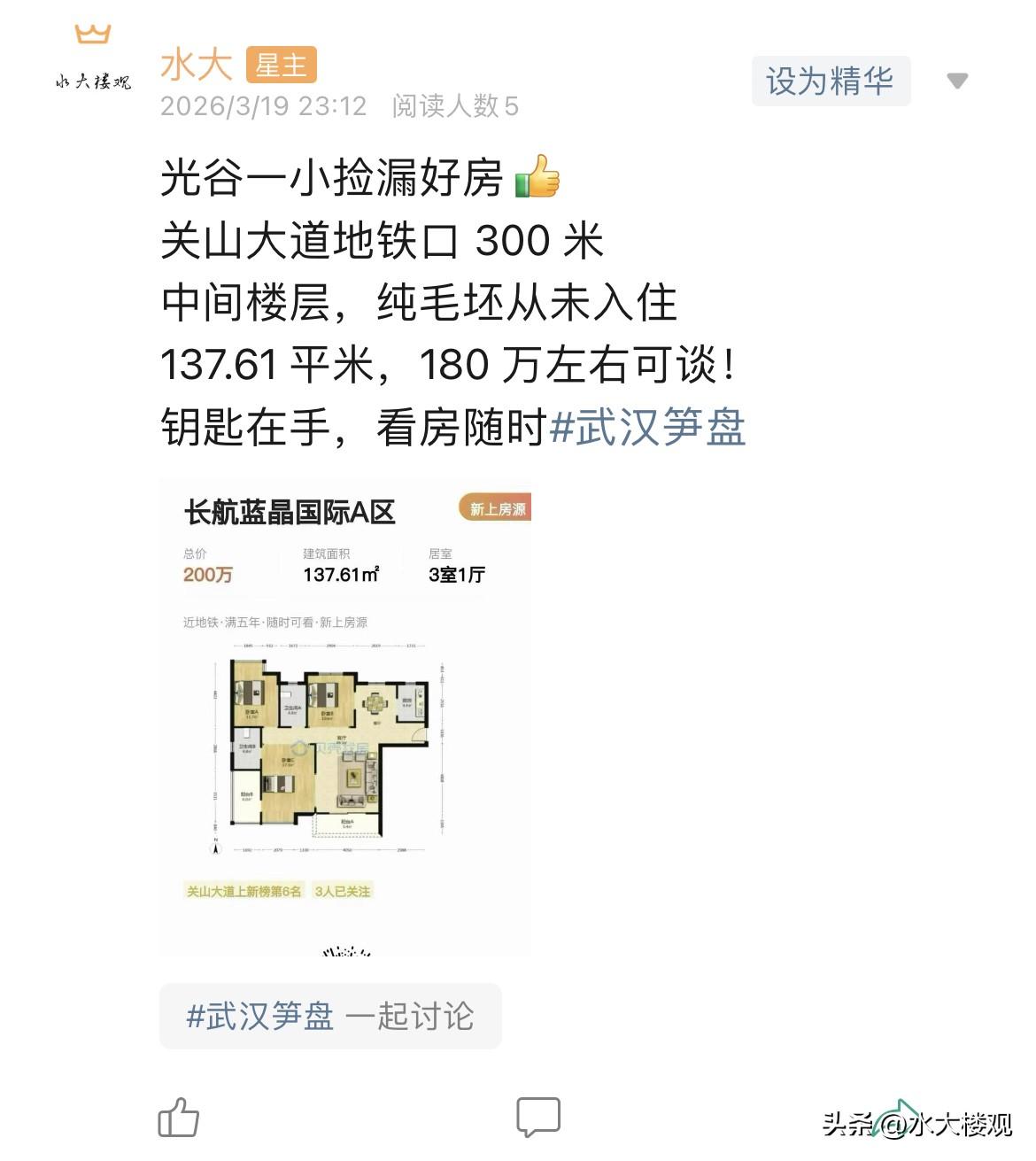今日美居 1.关山大道品质扛把子,清江山水洋房,软件园旁边,工作生活两不误。 2.琨御府经典四房户型,而且有三个卫生间,170户型,现在价格也很便宜了。 3.这个房子感觉品质很一般,但是价格很便宜,确实户型还可以,正地铁口。 房价已经止跌回稳,各位不要错判形势,该买就要买,中国经济前景无限,中国房地产目前健康水平空前,具有极大的购买价值,有需要的,不要犹豫,马上买!