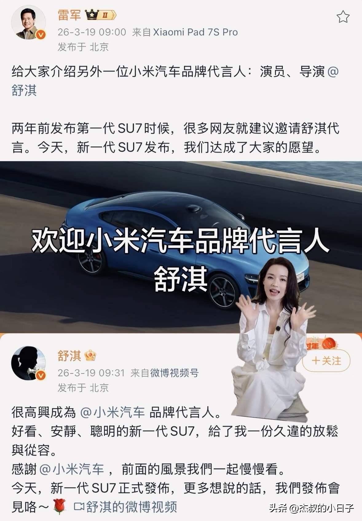 小米请舒淇做代言人!对还是错? 现场看到舒淇的这张现场照片,不得不说,舒淇姐姐那是真的漂亮。 她属于年纪越大,越有韵味的女人。 好,回归正题: 舒淇合不合适做小米汽车的代言人? 舒淇,76年出生的,今年已经50岁了,保养没的说,像30岁的。 再回来看小米汽车的客户群体,根据懂车帝的统计。小米汽车YU7的客户80%是20岁-30岁,平均年龄27.7岁。 小米汽车SU7的年龄分布26-35岁,平均年龄30.9岁。 可以说非常年轻。他们的群体有舒淇搭? 第二,雷布斯说选择舒淇和苏炳添都是因为他们名字带“SU”,哦哦原来还有这样的逻辑? 所以,你觉得舒淇合适吗?