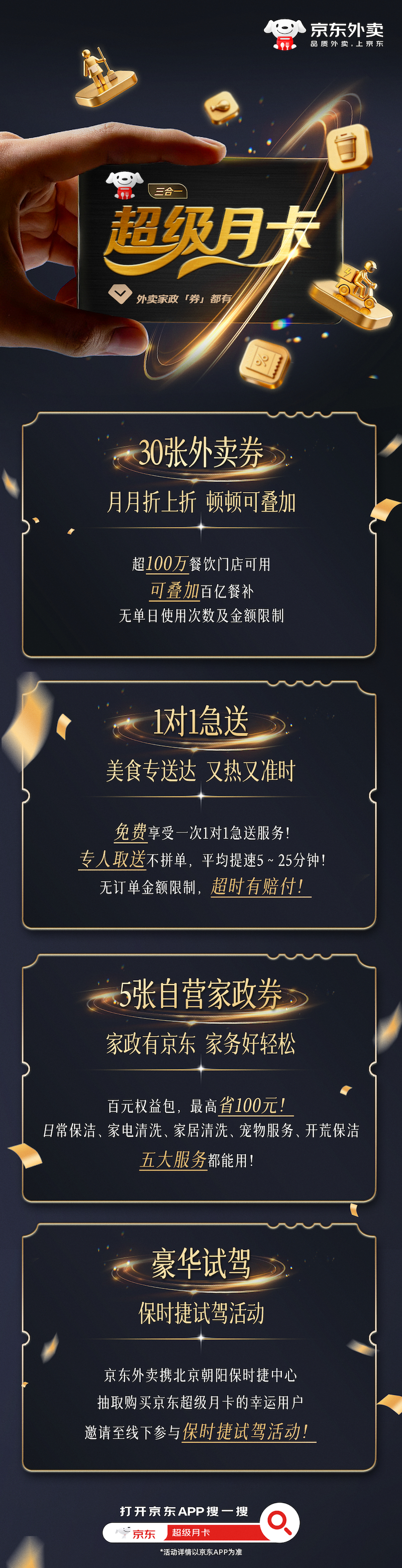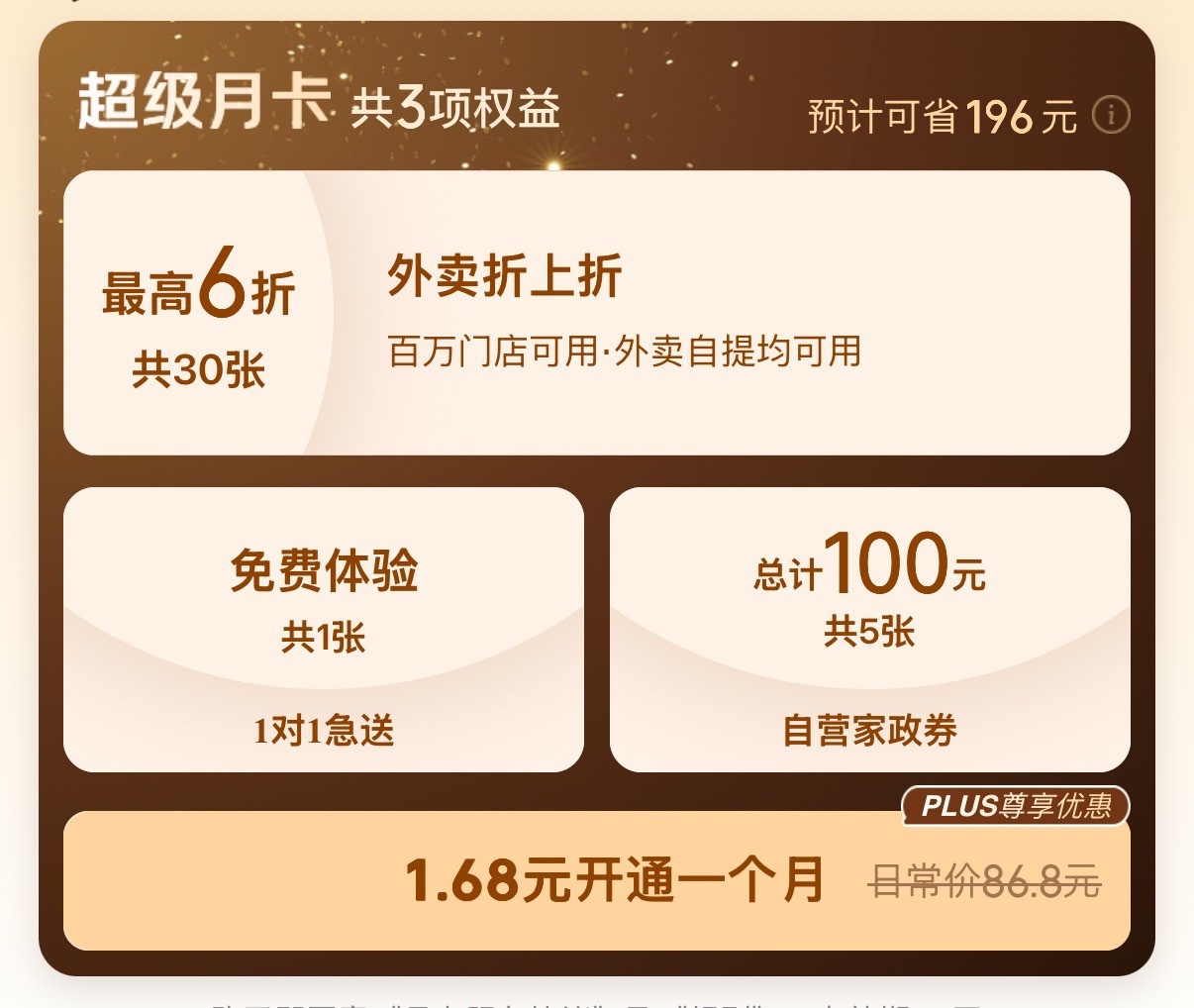 老大向你发出提醒,京东外卖超级月卡惊喜上线 !!我宣布京东外卖超级月卡就是当代懒癌患者的救命稻草!30张外卖券+5张家政券+1次急送,PLUS会员和新用户只要1.68元起!外卖券还能叠加,最高6折,点奶茶、干饭都能省出一杯冰美式!家政券直接把周末大扫除外包,轻轻松松焕新家~一次免费1对1急送服务随叫随到,再也不怕忘带钥匙被关在门外啦!这性价比直接卷到外太空!打开京东APP搜“超级月卡”或戳网页链接 为自己安排外卖超级月卡 ,有京东是我的福气! 京东外卖 京东春分 春分